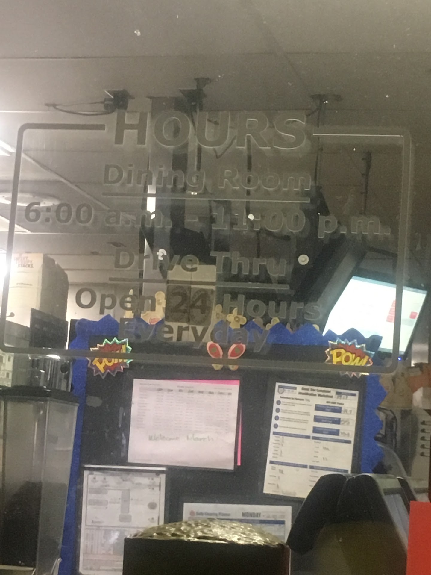 Read moreWell, another bad review!! Avoid this place unless you like throwing away $$. Stopped here after attempting to stop at a Wendy's (which is what i really wanted, and sooooo would have rather had after coming here) that had their dining room closed (my driver window is broken! Lol). The cashier was a little quick on repeating my order back so I got confused, I just wanted to make sure she had it right! -not sure if that led to my food getting scorched or if that is just how they serve their food. I took it to go, because I was on my way to work. So I had no way of knowing that my crispy chicken sandwich was fried so long there was no chicken left, just breading, until after I bit into it. I was really craving something other than what my job offers, and was extremely disappointed, being nearly 9 months pregnant, I wasn't able to eat before my shift. Shifts over, I wanted a refund or a new one! I go back, and they are completely closed, at 10:35. Signs say 24 hour (but Google says 11pm) either way, they do not seem to follow hours of operation either. I unfortunately went here for a quick bite without reading reviews (which in this case are extremely legit for this location) and wasted 10 bucks that could have definitely been better spent,...