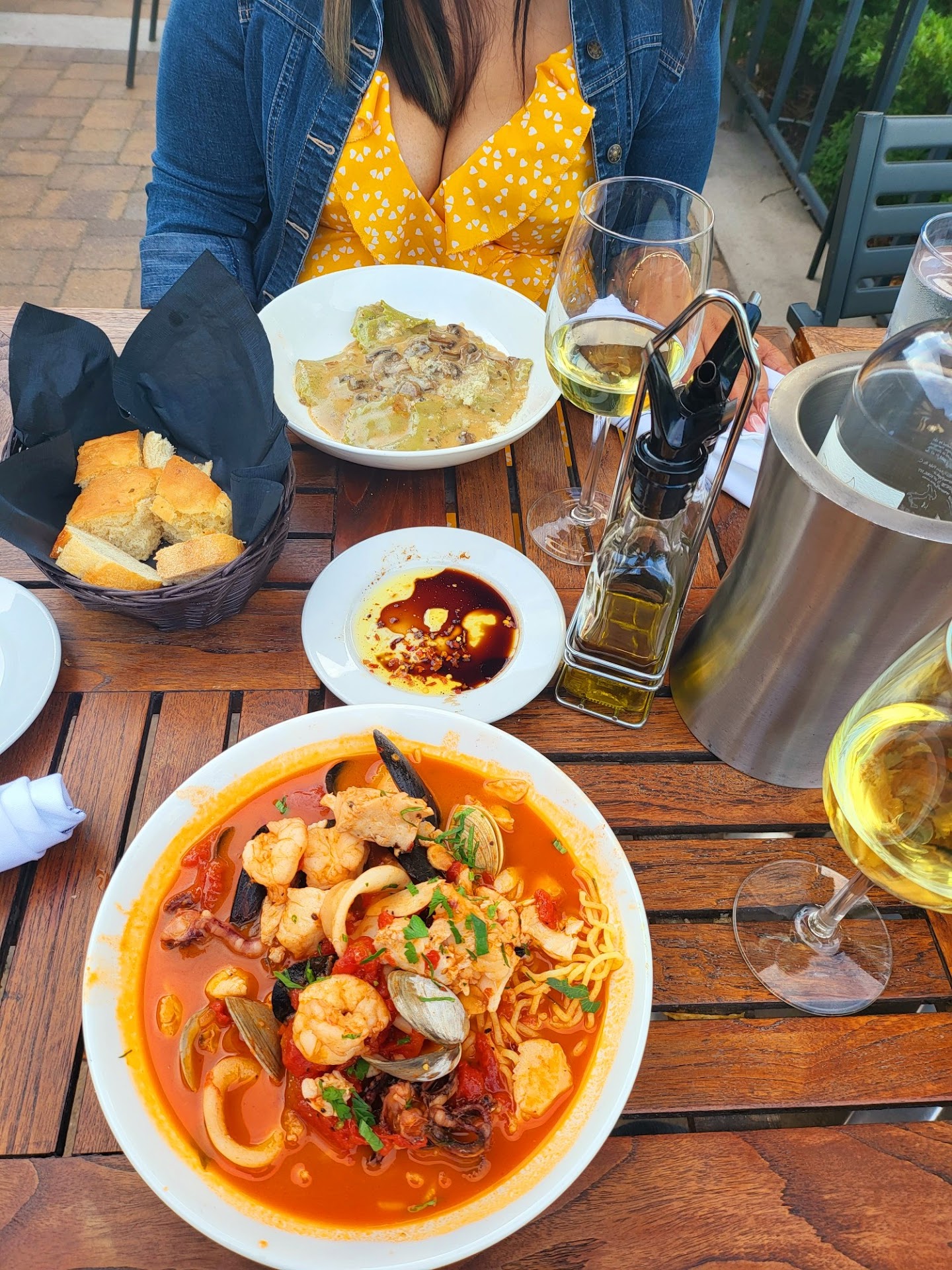 Time for the food: We both decided to try something new this time, but my reason for going here is the memorable Gnocchi. I would drive hours to get this if I lived far. Best I've ever had! However, We started with a Bottle of Pinot Grigio ($44) and Bread w/Basalmic & Oil ($8). For Entreès We ordered the Braised Short Rib Ravioli in a Crimini Mushroom sauce ($24) and MY GOD if I ever imagined heaven in my mouth this IS IT!! We also ordered the Cioppino ($28) the brothy tomato sauce was so delicious, seafood so fresh and cooked to perfection. Nothing chewy or over cooked. Muscles, Clams, Octopus, Calamari, Shrimp and Fish danced in this broth with homemade spaghetti noodles. BOTH dishes so so so GOOD!! As if I could eat more, we finished with the Crème Brûlèe ($9)..
