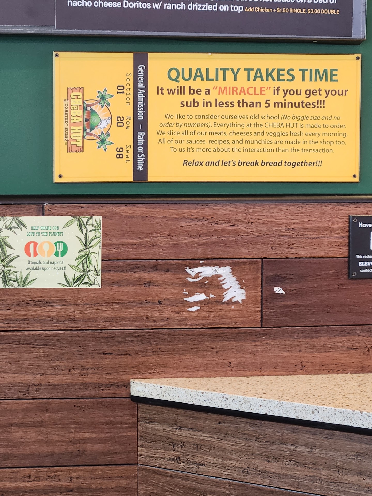 Read moreWe used to come every other week, however we had to put our late night cheba huts stops on pause as we just had a baby a month ago. 2 weeks ago we ordered our usual order to go and when my boyfriend came home, my sandwich was completely wrong, for example who puts mozzarella cheese on a kali mist?? :/ my boyfriends order was correct. I tried to eat it but it tasted so weird. I left it alone cause I figured it was late and the restaurant was about to close. Today at 10:45pm, my boyfriend went and got our usual order again and once again it was messed up, this time BOTH sandwiches were messed up. Everything that he wanted on his they put in mine. His sandwich was bland to the point he had to use our mayo from home to at least add a little something to it. Unfortunately it’s a hassle to go back out and take the food back, especially when you’re starving and have a newborn. At least this time we were able to take the loss AGAIN and eat a little bit of the sandwiches.. we’ve never had issues here, and we love coming here, however the last few times makes me hesitant to go back.. I’m not sure if it’s a new crew, my boyfriend says he doesn’t recognize any of the employees from when we used to come in…. It’s unfortunate cause this is the only sandwich...