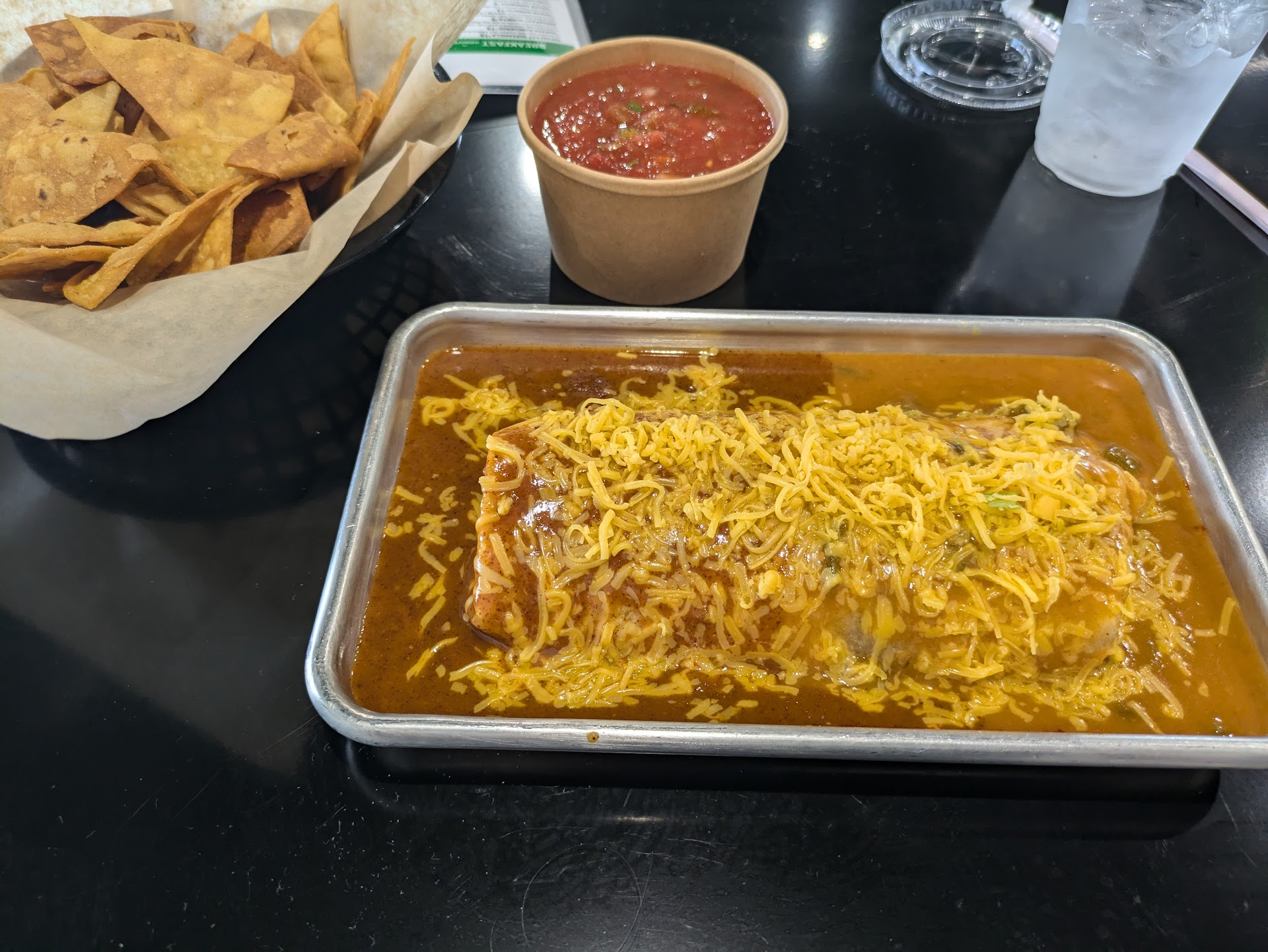 I ordered my burrito Christmas (smothered, half-red half-green) to try both of their chilis. I preferred the red chili over the tomato'd green, but both were decent. Neither was particularly spicy, unfortunately, registering at a mild-medium by my taste. The burrito didn't look huge, but I still left feeling sated, so it might just be that I'm getting used to massive burritos.