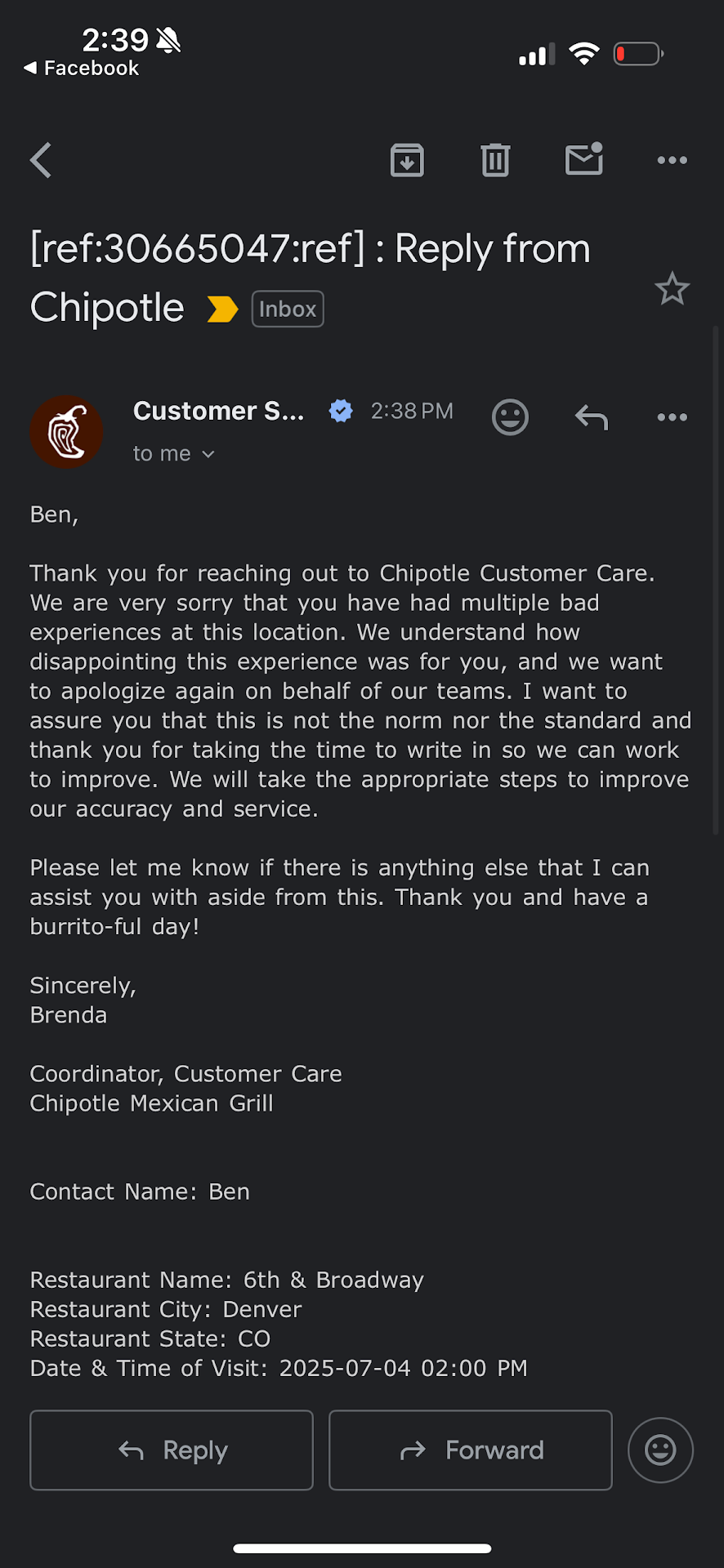 Read moreFor those that read reviews, I was absolutely floored at the insensitivity of the employees that work at this Chipotle. I need to say that I made attempts to call this restaurant to speak to a manager but that isn't possible on their end. I did notify Corporate. Our daughter went in to order lunch on 9/22/25. This Chipotle is right next door to the only Trauma One hospital in Denver, Denver Health. She works there. She is undergoing chemo treatments for a deadly form of breast cancer. As can be expected, she lost all her hair. On going in to the restaurant, a male young employee called her "sir." She corrected him and then he commented to a female employee that he just called her a "sir." The female employee responded "If she didn't shave her hair off, this would not be an issue!" She was horrified at the treatment, and as a mother I am beyond words for the lack of sensitivity. Probably thought she was gay, which she is not, but this is how the employees absolutely don't care about their place of employment. I am hoping a manager will reach out to corporate and get contact information and answer any questions. I am not optimistic that this establishment...