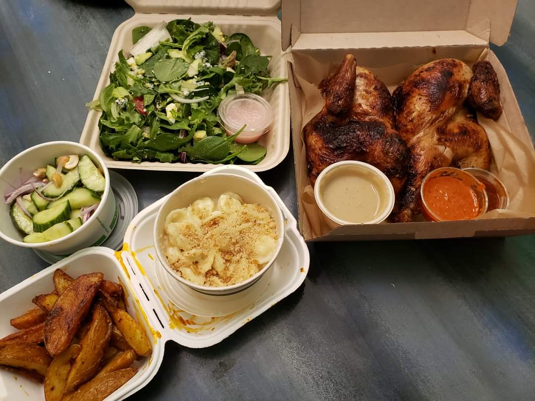 Last weekend we ordered takeout from Chook Chicken (Pearl St. location). Think: environmentally-conscience bourgeois âBoston Marketâ roasted chicken. Technically it is charcoal-cooked chook (Australian for chicken). There is another location at 8th/Birch near Rose Medical Center and soon to be one at the Stanley Marketplace in Aurora. The developers founded big names in Denver such as Snooze Eatery, Fruition and Mercantile. We ordered the whole-chicken meal âChook for Fourâ for $50. It came with three sides, one large salad and two dipping sauces. Yes, it would have fed four people, but we had nice leftovers. For sides, we chose the smashed cucumbers (light cucumber and red onion salad), Chook wedges (great fried potato fingers), and the mac & cheese (honestly pretty bland shells and cheese). The large cobb salad had boiled eggs and blue cheese and came with two dressings on the side (raspberry vinaigrette and a garlic cream.) The dipping sauces we chose were the Big Aâs BBQ (excellent home-made tangy flavor) and mumâs gravy (which was unfortunately disappointingly tasteless). The chicken was exceptionally moist, and the flavor had a little heat that went all the way through the meat. We suspect that they brined the chicken. The company cares a great deal about sustainability. You can tell this from the freshness of their ingredients and every single item of the packaging was compostable! The location on Pearl has a nice parking lot in the back. If you call the restaurant when you arrive, they will bring the...
