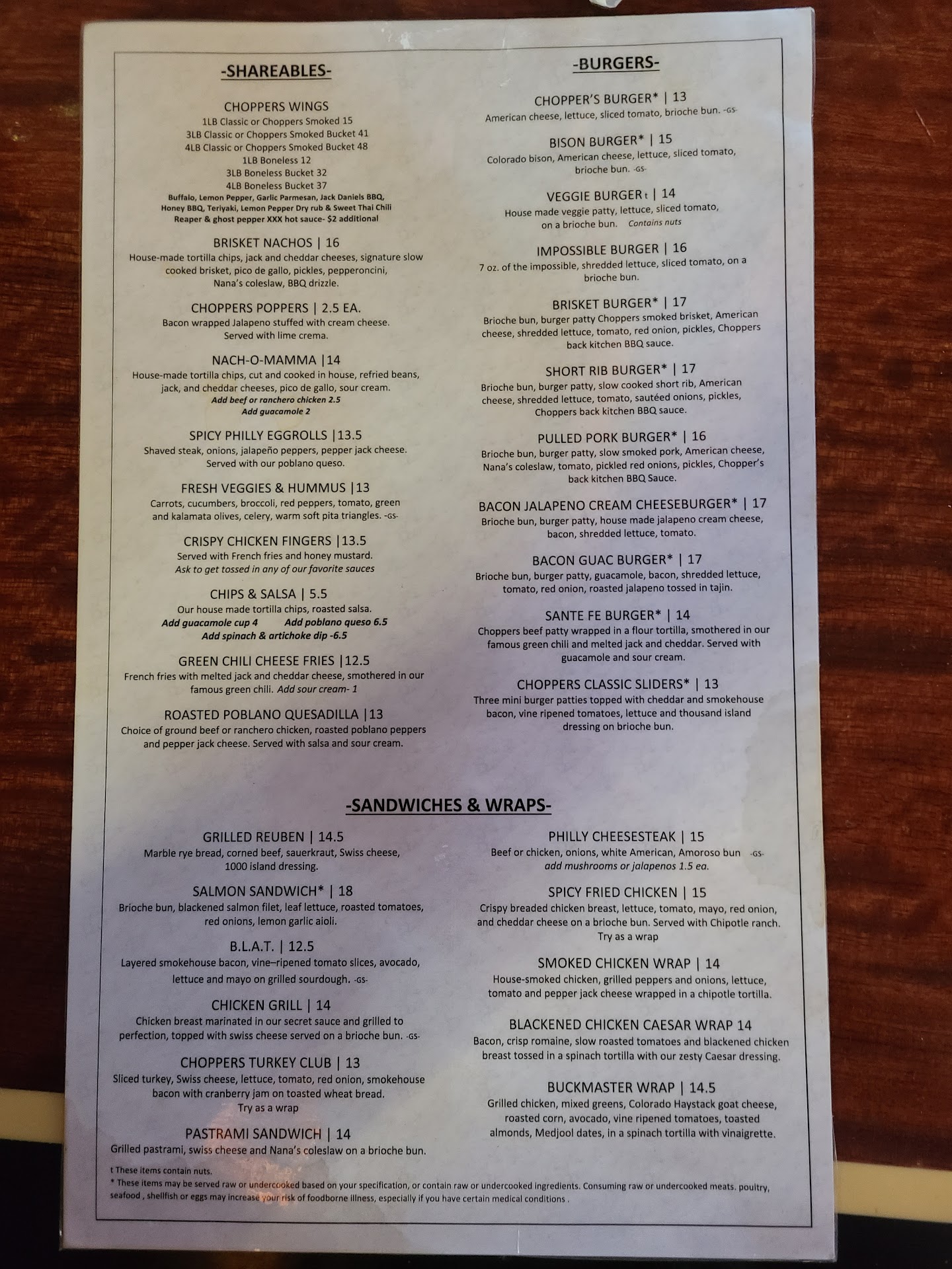 Read moreThis was one of the most disappointing outings we've had in a long time. I understand being short staffed and patience but this was a whole new level. We had a few drinks inside and then asked if we could move outside. Once we sat outside we were completely ignored. After 25 minutes we asked for our check and the young lady said she would be right back. 15 minutes later she came back with the tab for another table over $100 more than ours. We asked her to correct it, amid other customers yelling for her to please get their checks or bring back their cards. She took about a dozen credit cards, put them in her pocket and disappeared for another 20 minutes. We tracked down our original server and he was able to help us out. We wanted to speak to a manager but the poor guy was getting unloaded on by the rest of the people on the patio so we left. I was hoping to get a response from someone at Chopper's regarding this issue. We've been going there off and on for over 15 years and have always really enjoyed it. Hopefully they can find some better people and it will go back to the way it was. I really hope that I can update this review in a more...