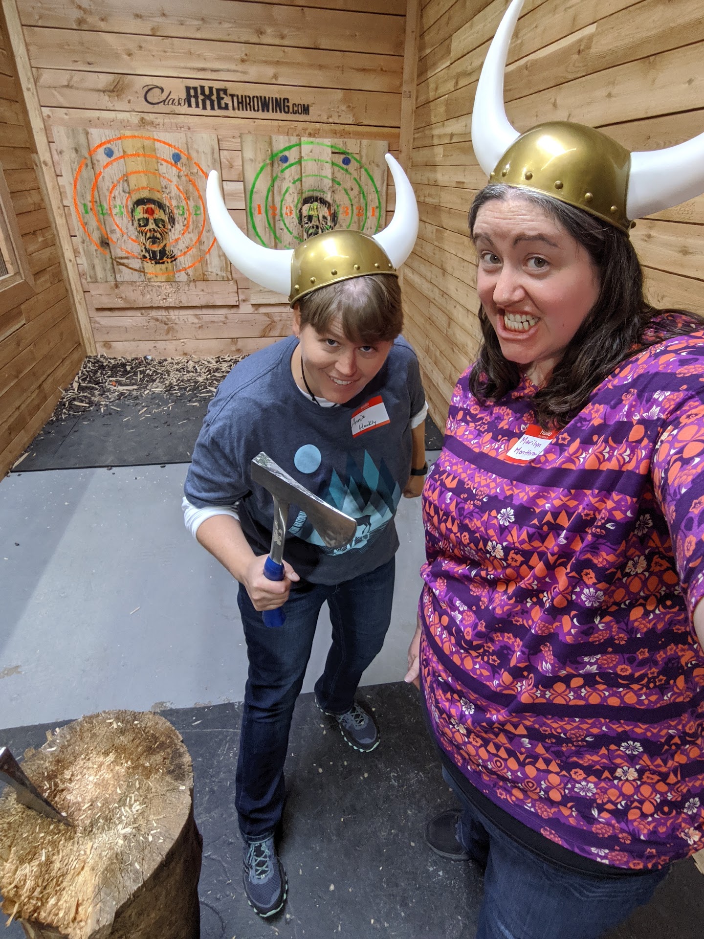 Here is what DIDN'T GO WELL: There is no one to check people in. We all arrived 30 mins early to fill out waivers, but no one could tell us what to/how to do that until 5 mins before start time. If there was a 'front desk' person, they could sell more beverages and make you feel welcomed. We seen someone standing behind the front desk and took 2 Gatorades out of the cooler to pay for them. He made me feel like a child getting in trouble, asking, "does your host know you are over here?" I told him we had been there for 20 mins with no host, so no... The bathrooms are outside. Yes, ladies...port-o-potties! I'll hold it! The website should mention this so we could use the facilities prior to coming. May I suggest Purell dispensers around the place... Our host, "chop it like its hot" or Jess (I think) was not prepared for this group. We were not mean or rude to her at all. It took her about 45 mins to warm up to our humor. We felt it took way to long to show the 16 people how to throw. Our group would chant "wet the wood" to get her to do just that. We noticed some of the other hosts "goofing" around with their guests, but not ours. The wooden door stop got kicked out somehow and some of our party and another's party got locked out. Being that there is no front desk person, they had to wait outside until someone went out to go to the bathroom.