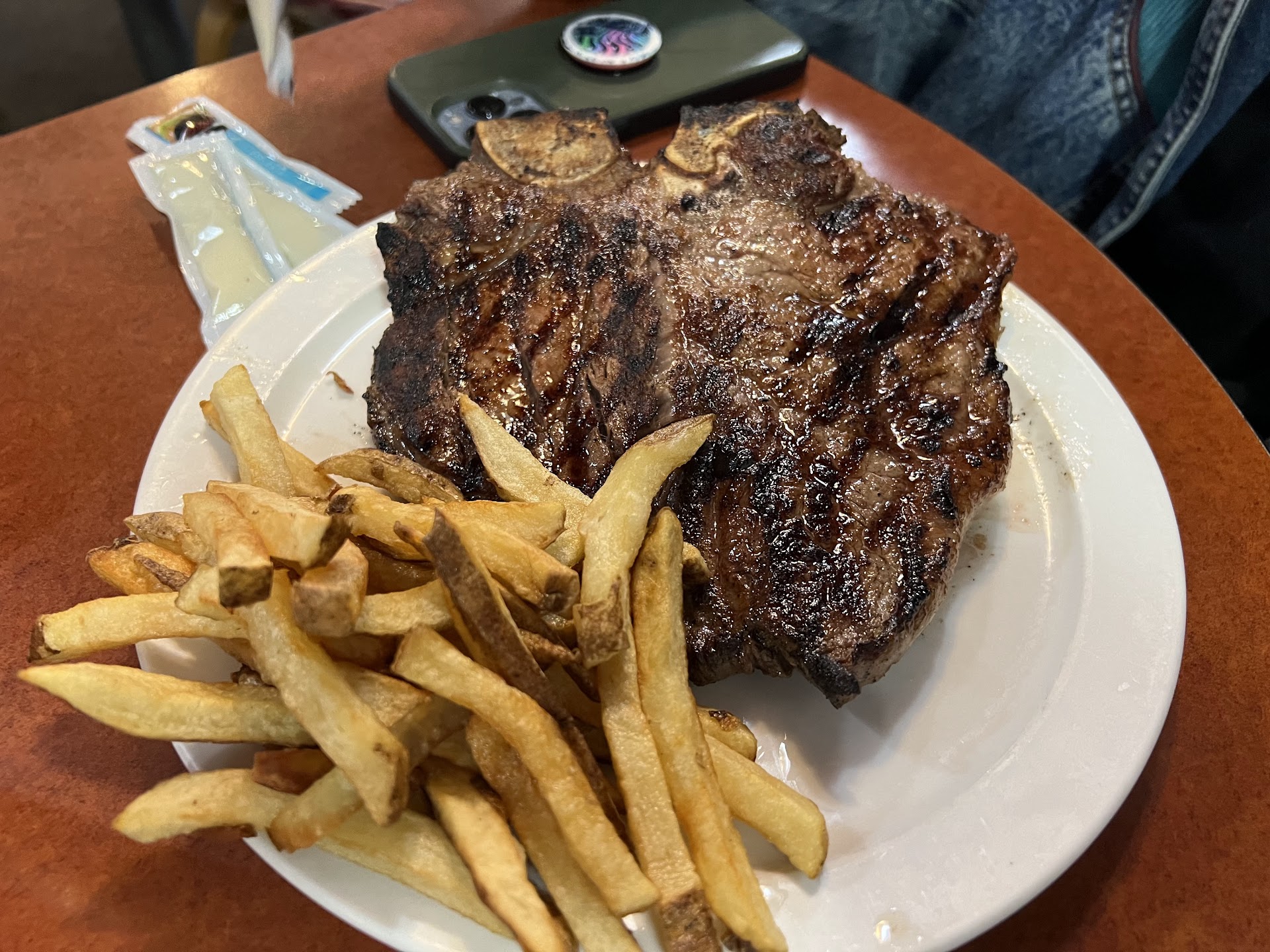 We ordered the porter house W/ baked potato and a steak sandwich with fries, both with side salad.