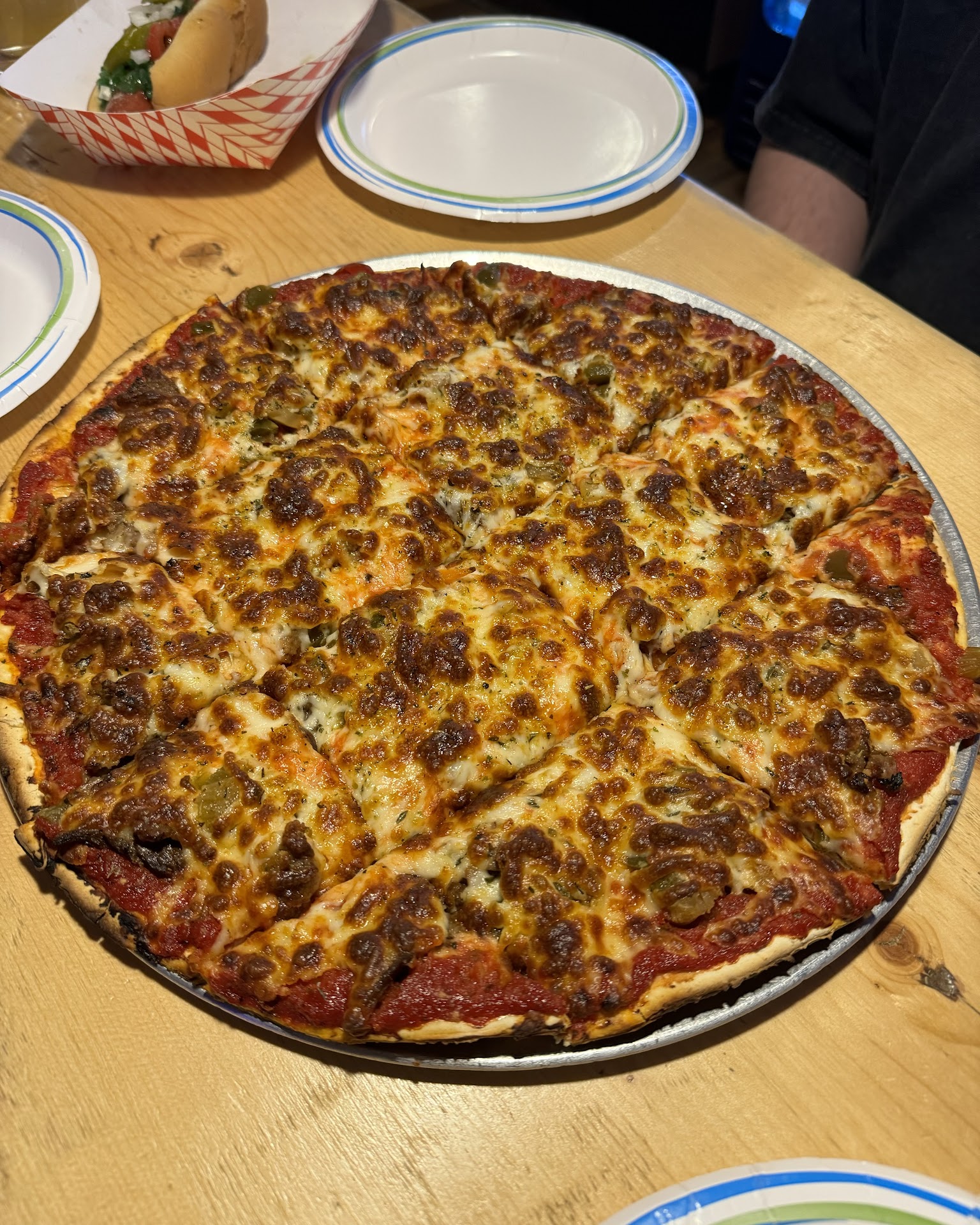 The sausage? Exactly what it should be. Chunky, well-seasoned, hand-pinched, with that fennel-forward flavor that separates the real thing from the pre-formed crumbles you find elsewhere. The pepperoni is thicker than the usual razor-thin slices, giving it a more substantial bite, a deeper, slightly smoky flavor, the edges crisping up just right.