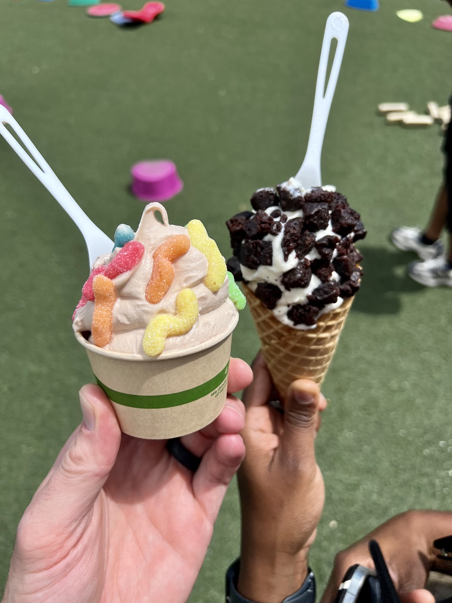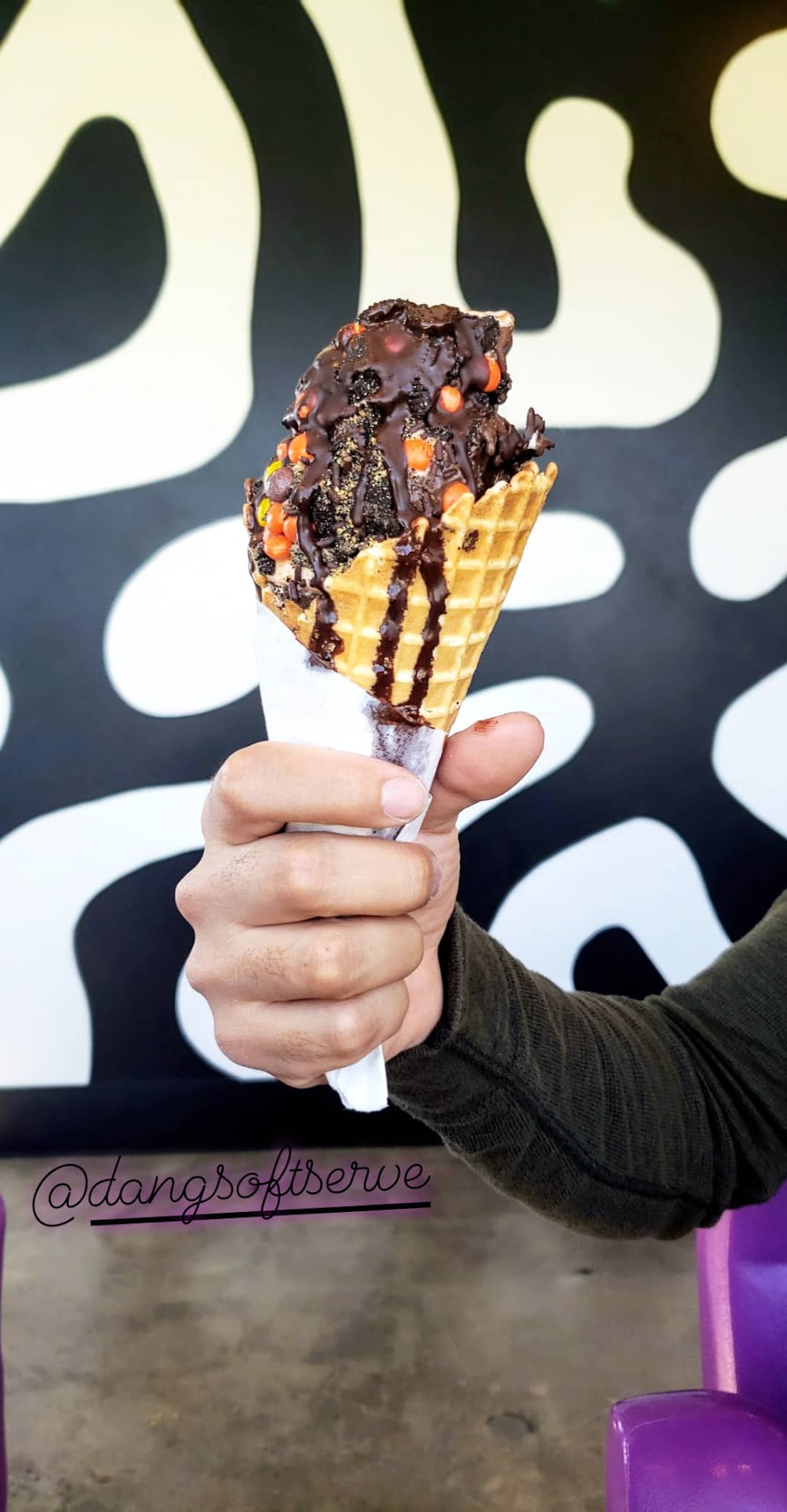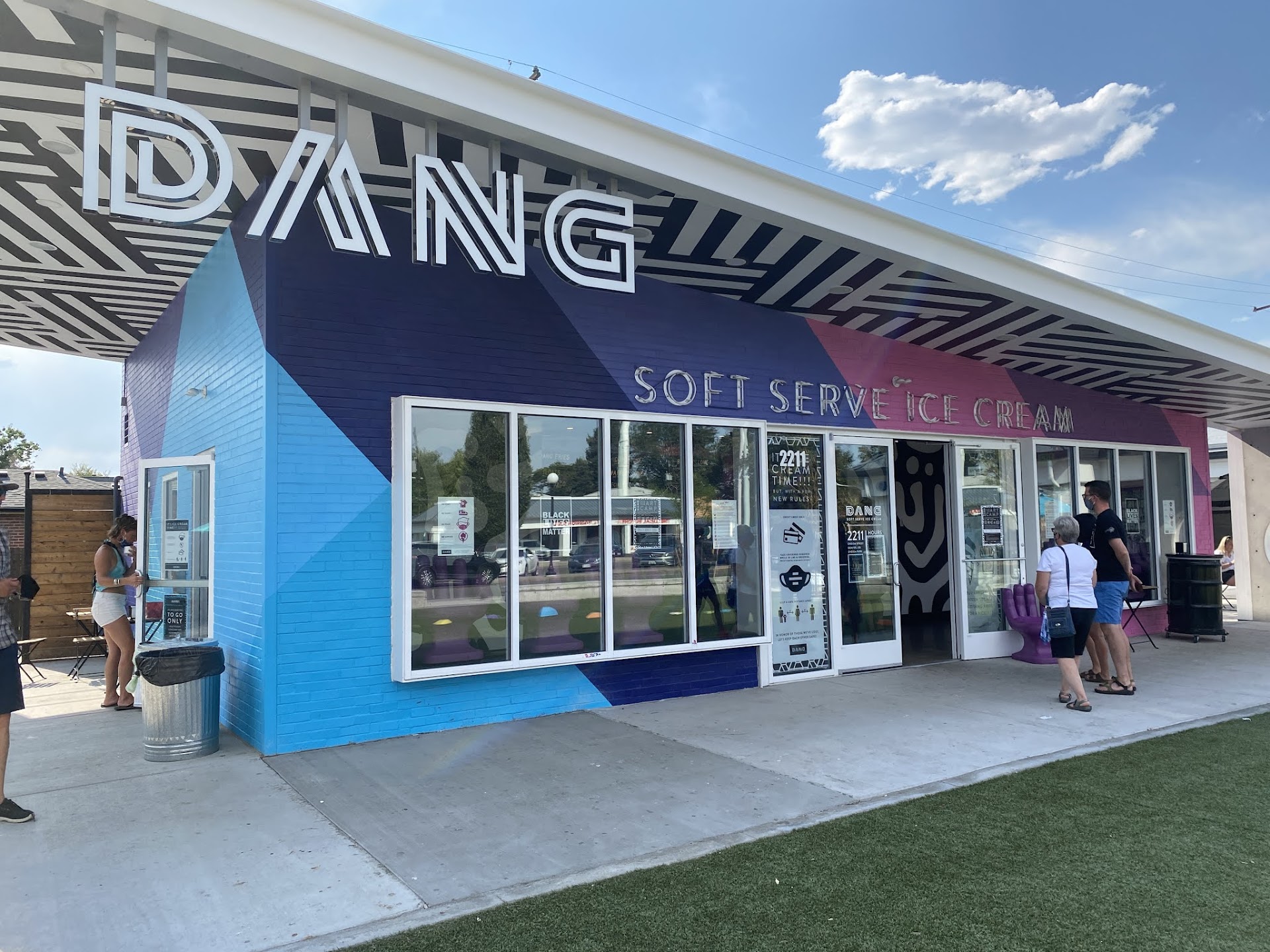 Read moreWhat a dang disappointment. There are very few soft serve ice cream shops around CO and was excited when I received the e-mail for the opening of Dang especially since we are HUGE little man fans! We went with our 5 year old and tried to look at a menu for flavors before we went. I did not see a menu of flavors...I guess I should have called first. There are 8 flavors total and you can make 4 different swirl combinations. There were only 2 guests ahead of us and it took quite awhile to get through the “line”. I can’t imagine how long this would take if it were a busy weekend/summer evening. I think this is because it is a timely process for them to get the toppings onto the ice cream that are served in cones, honestly even in cups. I’m not sure if it’s the consistency of the ice cream, but the toppings do not stay on. The servers had to scoop some on and use an individual bowl to then press the toppings into the ice cream. The poor little girl in front of us lost half of her gummy bears on the floor before she left the counter. Oh they had also run out of peanut butter cup topping the day before. That’s a pretty standard topping I would say. The outdoor area is amazing, but wouldn’t return due to the very unusual flavors. I’m sure some will absolutely love it. Just not for us. Flavors I can remember from today’s visit: Vanilla with charcoal so it’s black ice cream...not ideal for little messy ones. Black raspberry Creamsicle (Vegan) Chocolate (Vegan) not a hit with our 5 year old. Mexican chocolate(spicy) Caramel corn Matcha flavor I can’t remember the last one. I would also say they are quite pricey. $3.50 for...