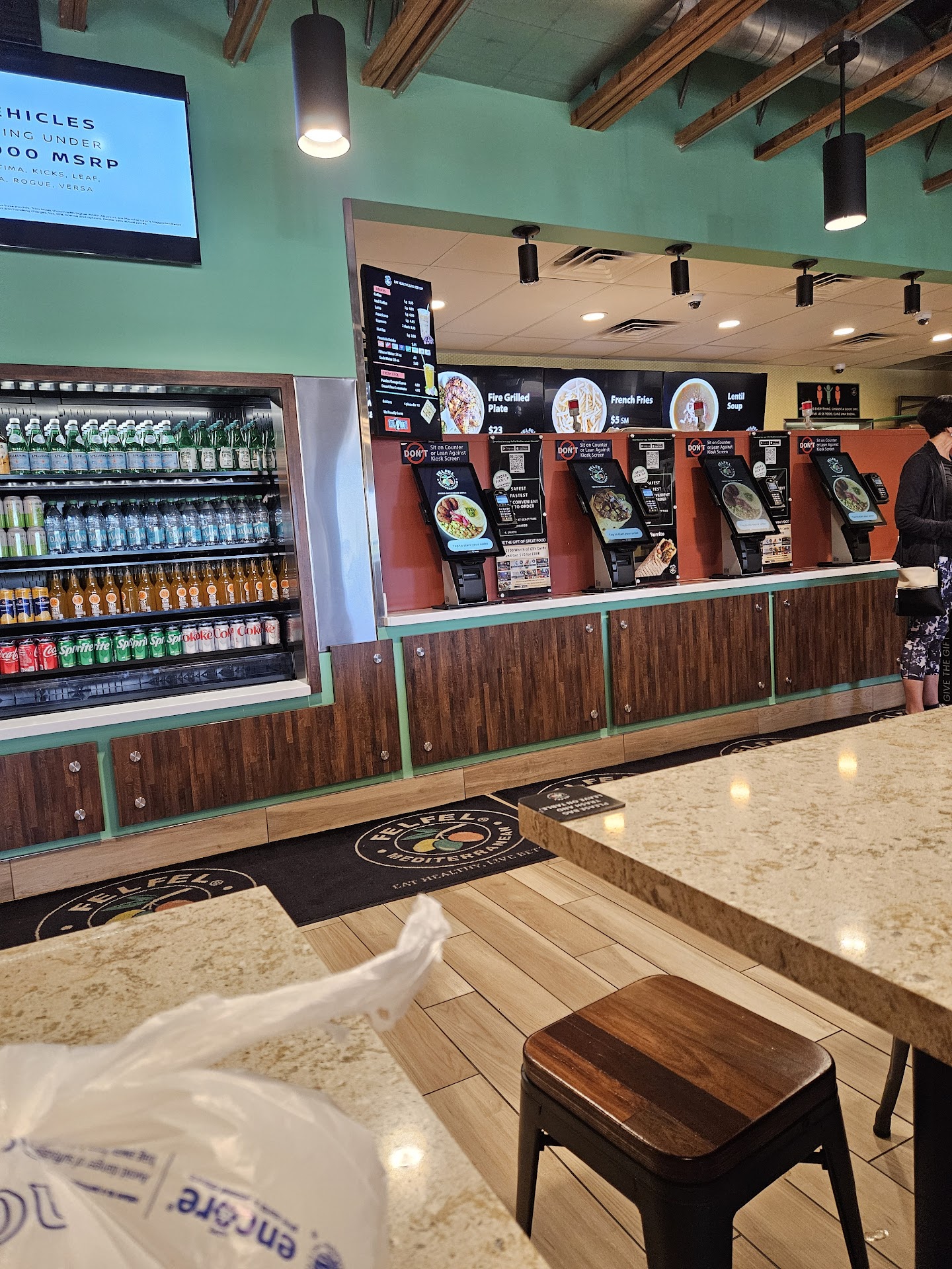 Fel Fel now forces you to use the self-serve kiosks to order which can be time consuming and frustrating. There were no staff members present while ordering, so customers are on their own while ordering. The sandwiches are very expensive ($13-17 for just a sandwhich) plus an additional $5-6 for a combo with fries or falafels and a drink. There are $2 upcharges for things like pita bread, instead of a whole grain wrap, a $2 upcharge for feta cheese, etc.Thus means the average meal comes out $20-24, which is very pricey for a fast casual restaurants and rivals the cost of many greek/mediterran full-service dine-in restaurants. To top it off, at the end of the self-service the system defaults to a 20% tip and you have to change it! A 20% tip should be reserved for great service at a full service dine-in restaurant, not for a fast casual restaurant with self service kiosks and no one to help you.
