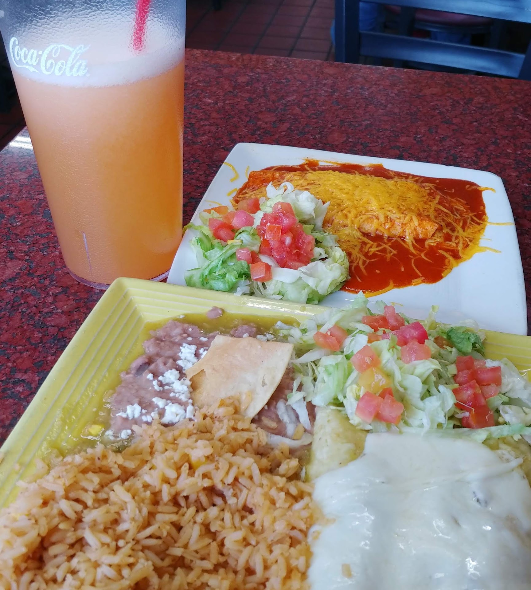 Image seen here: -Aguas Frescas Melón (was tasty, refreshing, in a huge glass about 36-40oz for $6) -1 cheese enchilada w/red sauce & garnish salad (red sauce is mild, kinda bland), -Enchiladas Suizas (2 shredded chicken w/tomatillo sauce & quite tasty mozzarella cheese. This is a MILD dish if you need one, I liked it), -Rice & beans with additional garnish salad, which all tasted kinda bland.