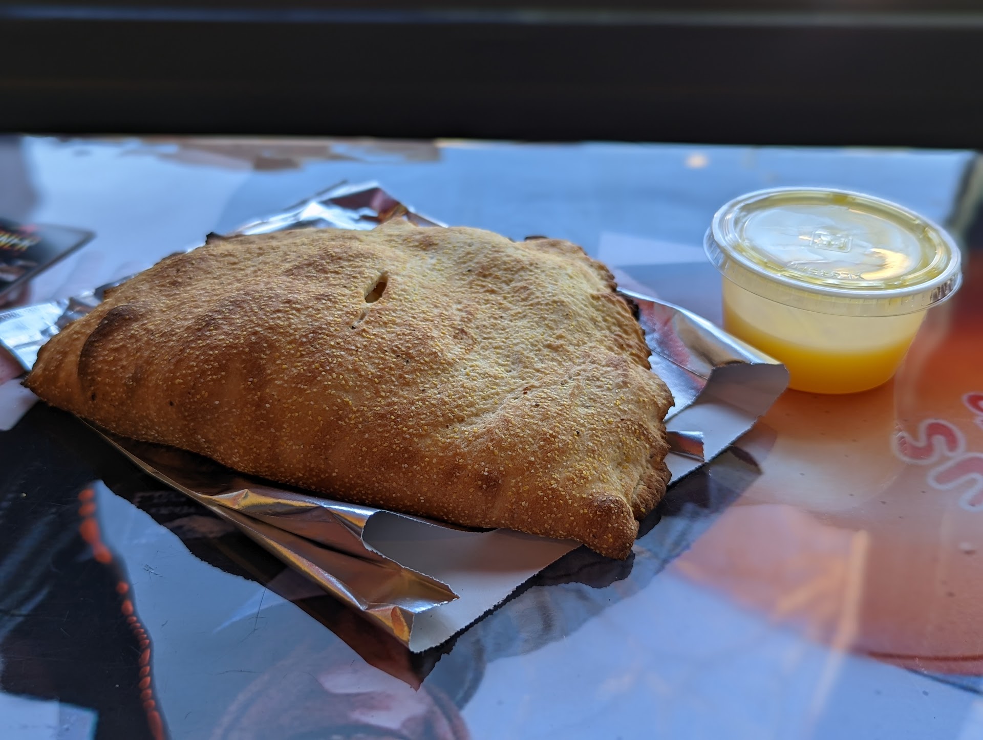 Read moreI love calzones and bad jokes so when this showed up in my neighborhood I was excited to check it out. The location is super cute and the references are tight and fun if you appreciate camp. The menu is clear and concise, and the place is clean. I got the Goose calzone with green peppers and was a little disappointed. The calzone cheeses and pepperoni are good, but the veggies go in raw/unseasoned. The marinara is fine but could be more flavorful. The crust doesn’t give that nice crunchy pop you expect from a good calzone, and is more like two pizza slices stacked topping-to-topping. I won’t act like I didn’t eat the whole thing, it tasted ok but was soggy.