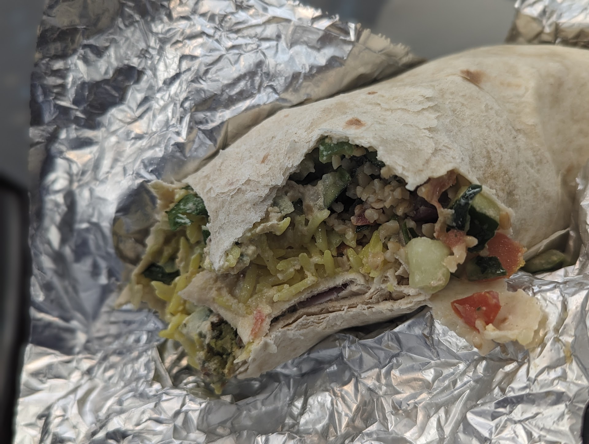 First, the wrap is like a tortilla instead of a lavash. Could be better if they used a better wrap. Ingredients that I chose with my falafel were pretty tasty. I chose taiziki, pickled onions, rice, regular hummus, cucumber and tomato, and grain.