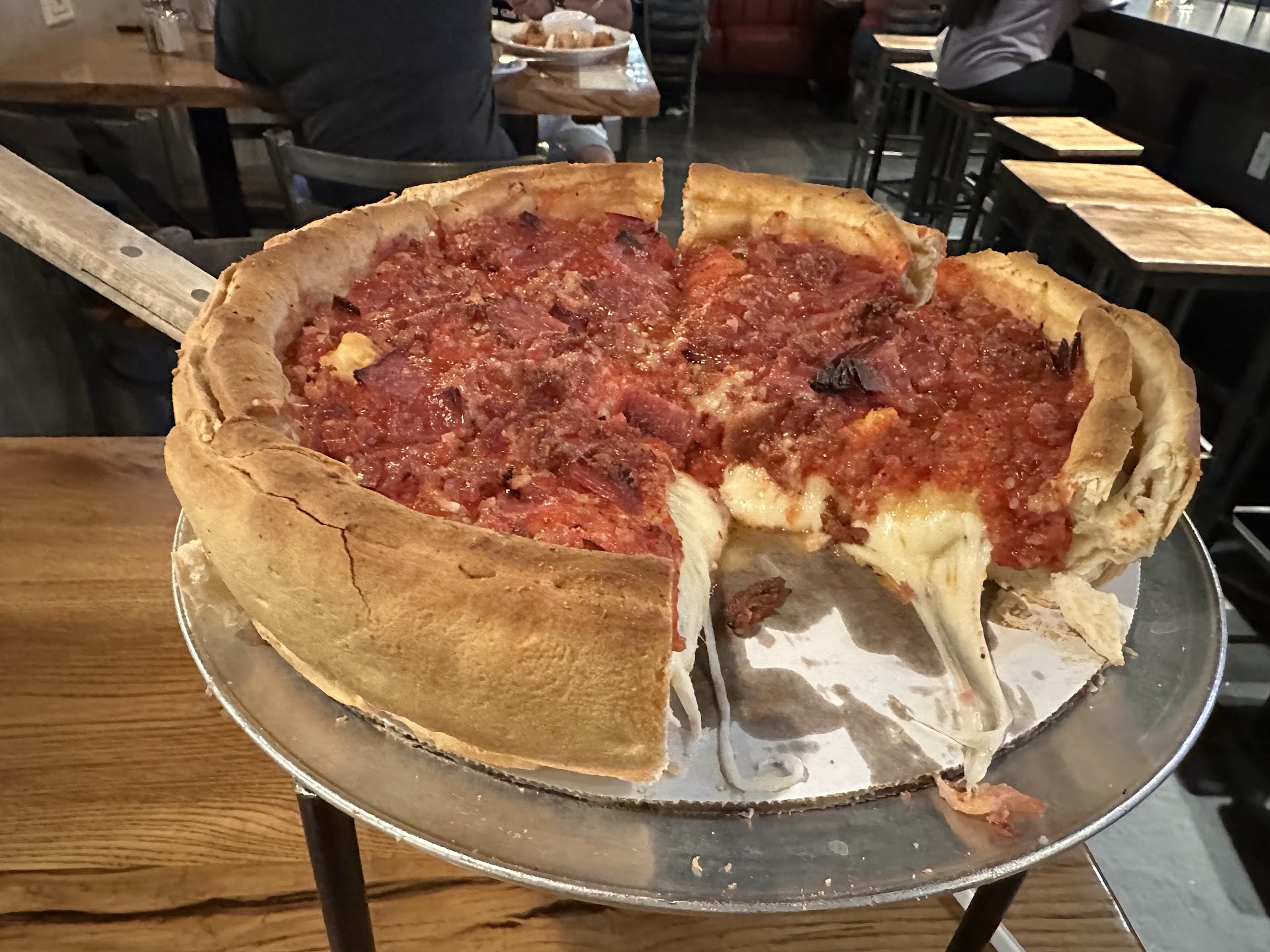 One of my harder reviews to write, first the waitress we had who was also covering the bar was excellent. You need to know they added “surcharges” to the bill that I didn’t see until after we left that are not disclosed, mentioned or pointed out when they give you the bill. We had the deep dish pizza meat version. The menu says they don’t let you make changes if we read it right (no substitutions it said so we didn’t try. It also not sure if we really had any better ideas based on what toppings they had). The deep dish pizza was very average and didn’t rise to a 4 star in anyway. The pizza sauce was uninspired in every way. The crust was not something any pizza lover could enjoy. The pizza overall was editable but was only a deep dish in theme not practice. Very thin layers of meat, maybe that’s the style in Denver but certainly not the style in any other deep dish place I have been to. I really wanted to be more inspired about the food itself, but just can’t because that crust and pizza sauce ruins it. I could forgive the sparse toppings, but not if you can get these other two things right. Additional issue was a foul sewer smell which lingered our whole meal time. It might just be a temp condition as they are doing some road work (picture included but there is no real indication of replaced sewer or open sewer. The patio as a result would be a difficult decision. Not sure one should blame that on them but the fact is it’s there needed to be pointed out and hopefully it’s only temp as I didn’t see any other reviews mention it. If this place fixed that pizza sauce at least it would make a material difference. One can live without perfect crust but the sauce really does need to be excellent. It’s all workable issues and I wish them the best if the decide then want to try something. And who knows, maybe tonight’s pizza sauce was because they ran out and west to the Safeway and made a...