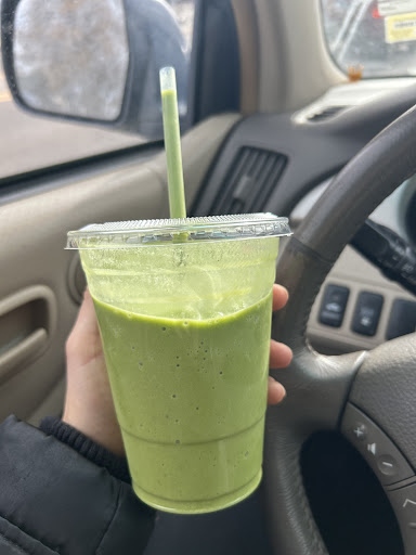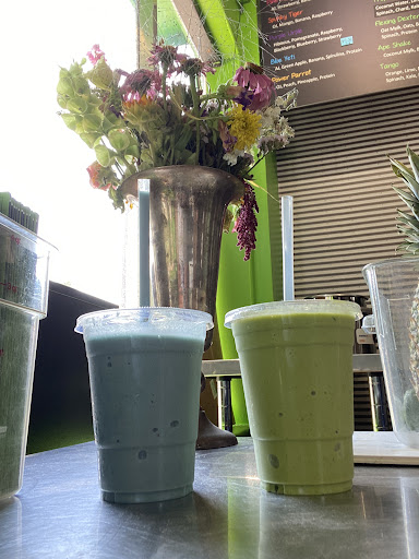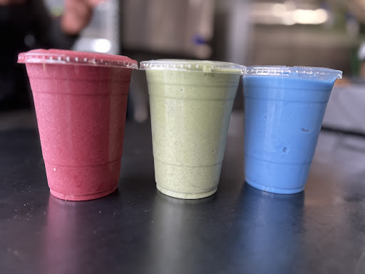 The blue cup is Smurf Juice, it has spirulina, apple, and we asked to add Coconut to it. (Also amazing)