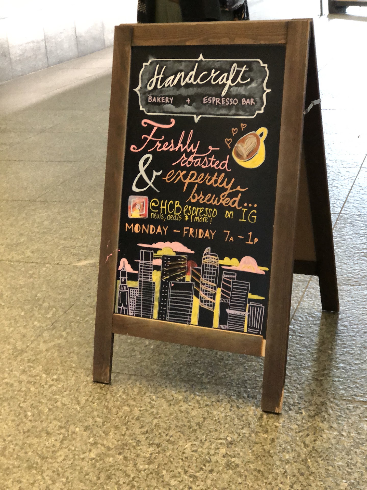Handcraft Bakery and Espresso is on the street level of a high-rise building.