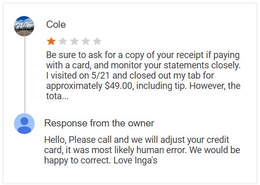 Read moreMy friend and dined at Inga's a couple of weeks back. We had been in before and had a pleasant experience and the food was really great so we decided to try it again.