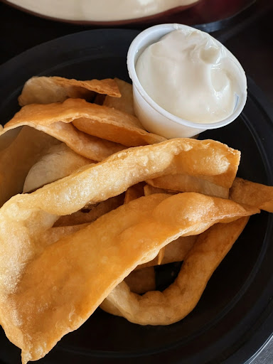 I chose the gyro bowl, which was very delightful. It came with a generous portion of rice, gyro meat, and toppings like lettuce, cucumbers, and feta, as well as sides of tzatziki sauce and hummus. I was also given a side of chips with a garlic dip, which was a pleasant surprise!
