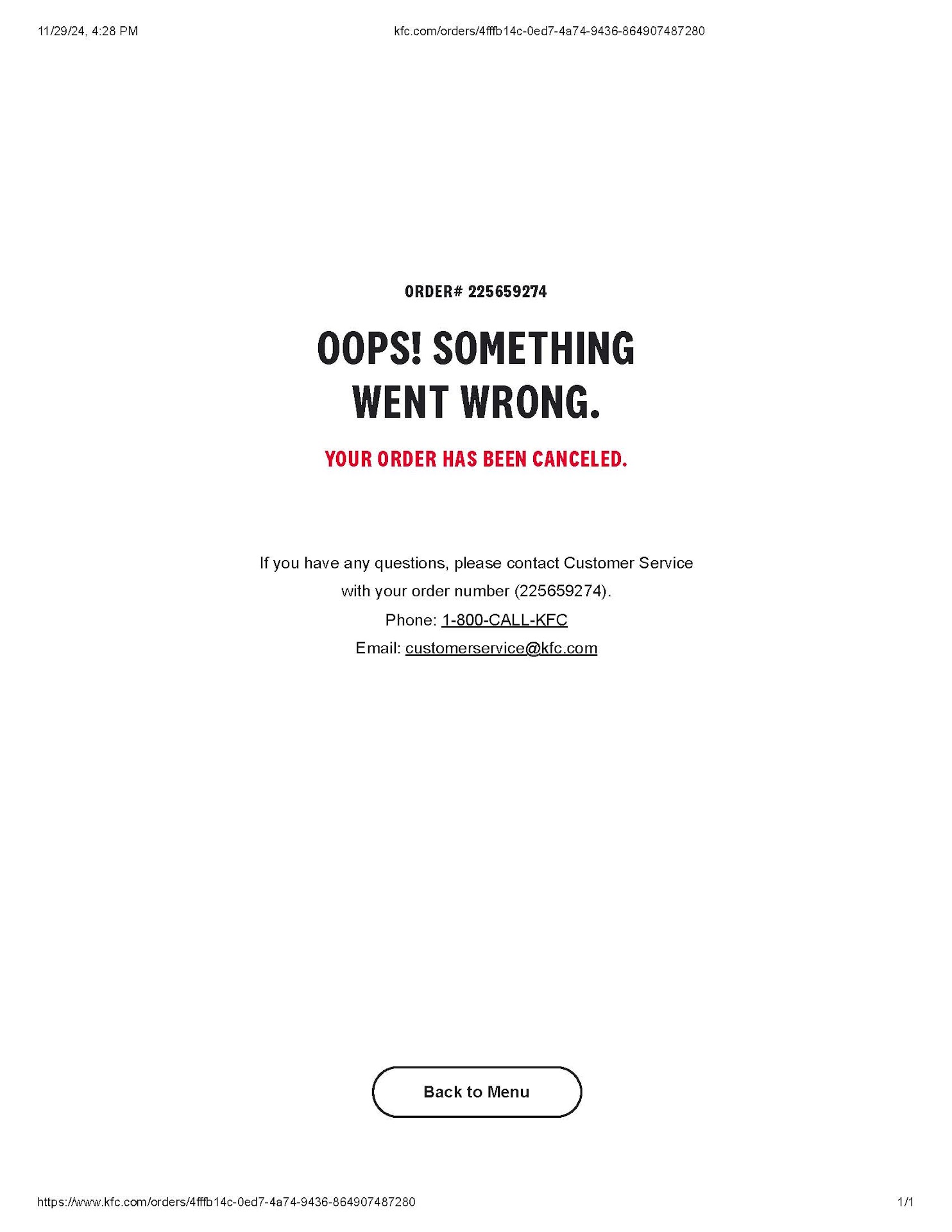 Read moreI tried to place a larger order several hours ahead to ensure they would be able to accommodate two 16 pc family meals. After going through the process of entering all my info, they immediately sent me a notice that my order had been canceled. They processed the payment already but immediately canceled my order. After 40 mins on call with the pathetic customer service i was told there is no resources available to remedy this and someone MAY call me next week. They also said the funds MAY be credited back in 3 days. This is pathetic! Big corporate entities just see us as peasants! When will WE stand up and stop letting these companies STEAL, lie, cheat, and abuse us. They make it near impossible to even make a complaint and offer NO recourse or options to rectify this blatant THEFT! Now, I have to find someone else to accommodate my dinner party without the funds available on this card. I would have understood if they just rejected the order initially without charging my card but the fact that they took my money and immediately just canceled my order without any apology or explanation speaks to the ethics and integrity of this company. to make it worse, they intentionally make it difficult to even complain about this abuse...