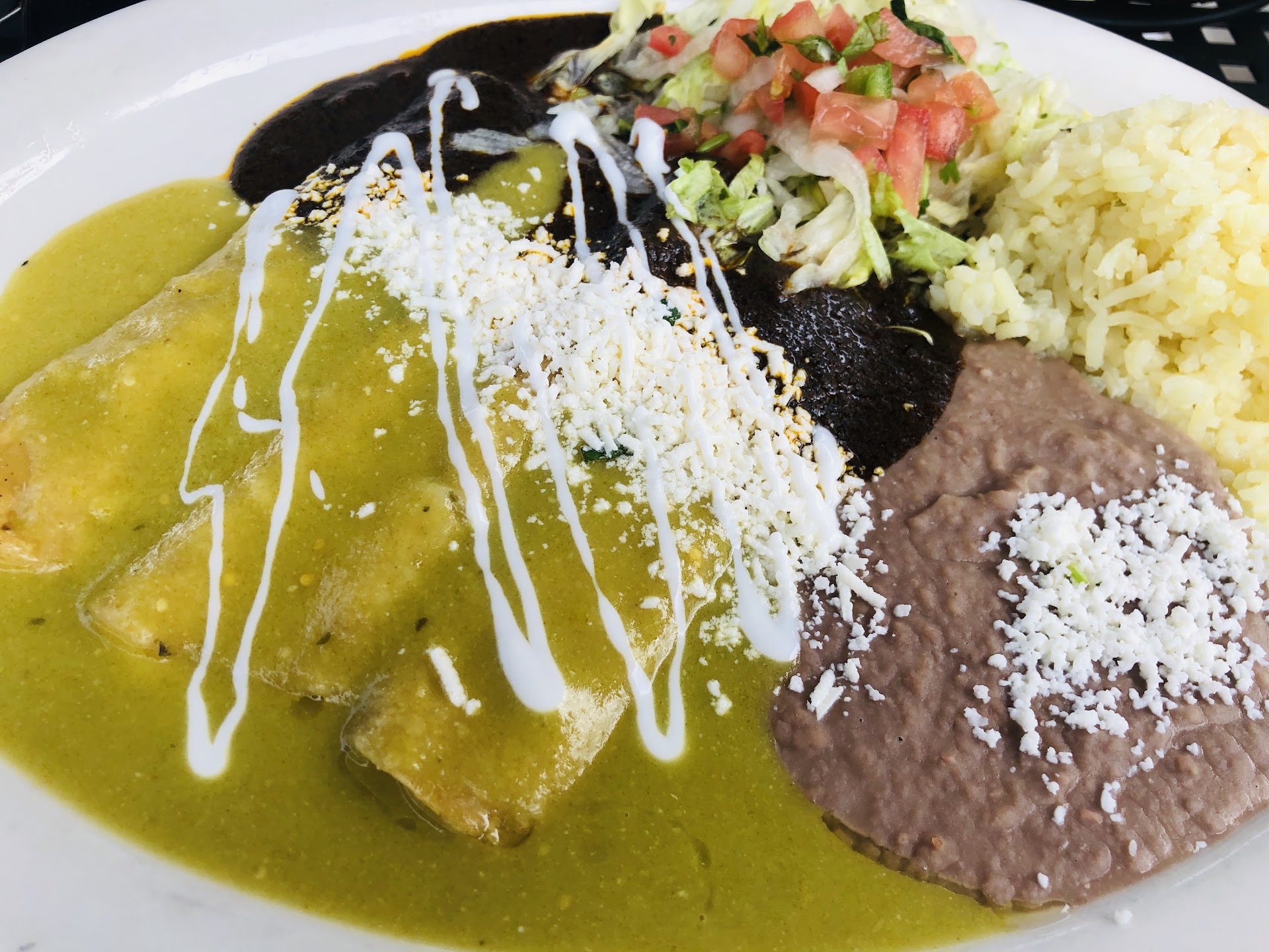 The Enchiladas de Oaxaca was made with three corn tortillas filled with cheese & carnitas and served with refried beans, rice, lettuce, pico de gallo, and mole. The classic Oaxacan-style enchiladas were doused in sauce and stuffed with meat & melty oaxaca cheese making for...