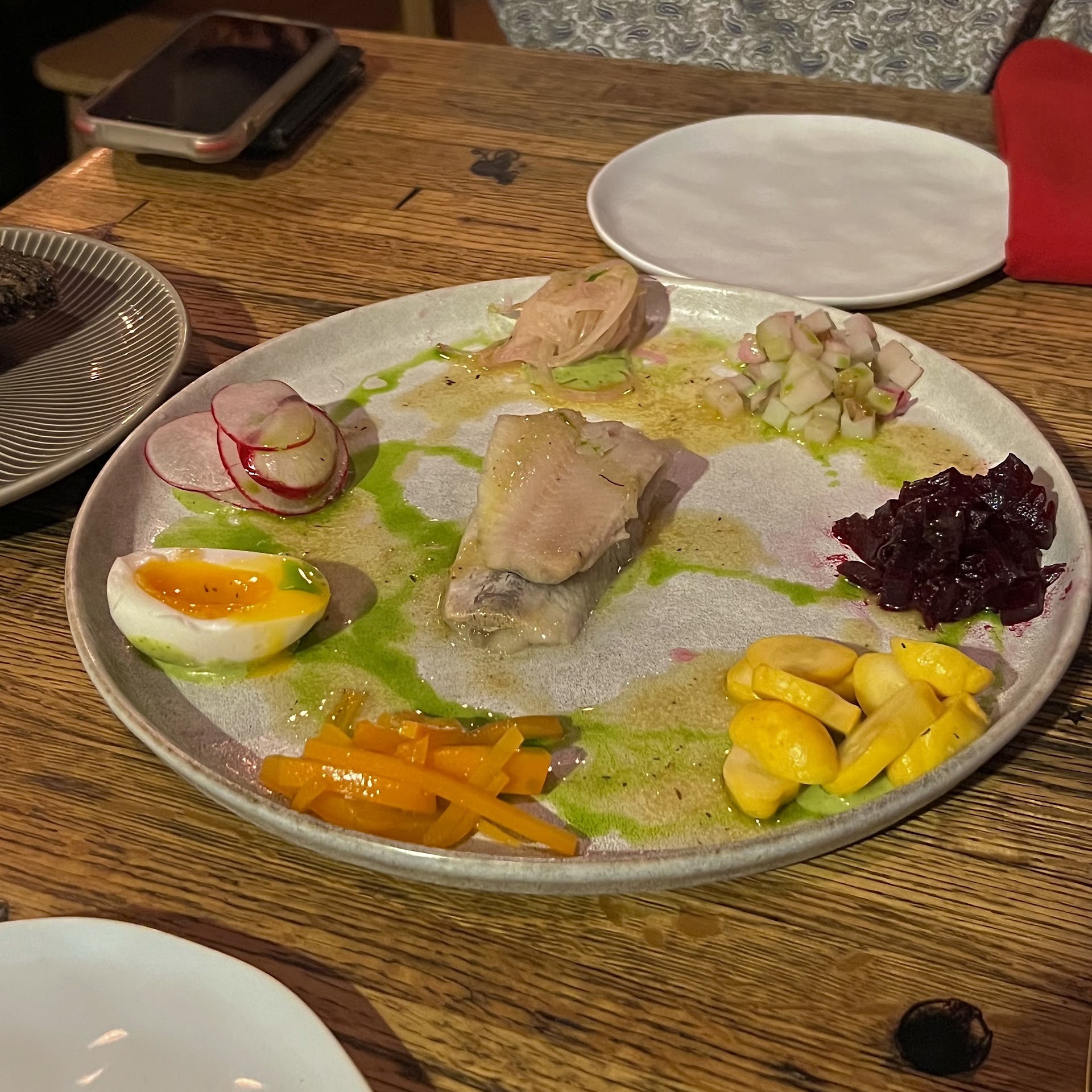 The sausage of the day was our first dish and was a perfect beginning to the meal. Cloves, cardamom and other warm spices were perfectly cooked into the sausage. The charcuterie-style board of pickles and mustard was perfect for settling in.