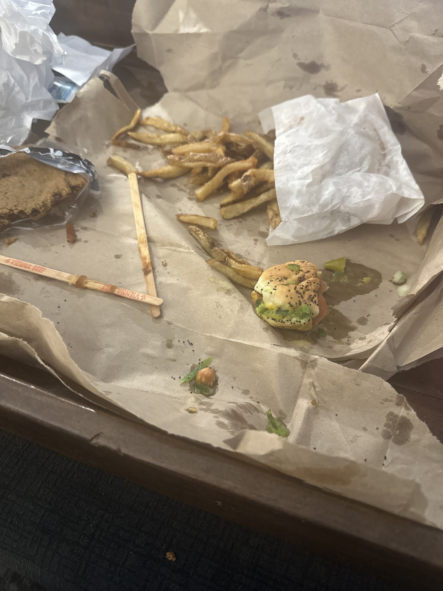 We get inside and after changing my now ruined clothing, we open our bag to find sandwiches unbelievably soggy, our fries were soggy because they were either refried or not fried enough, and we were down to one drink.