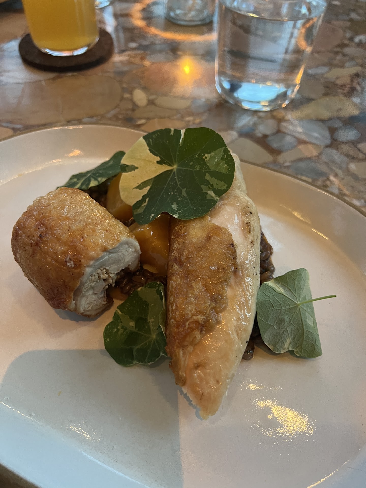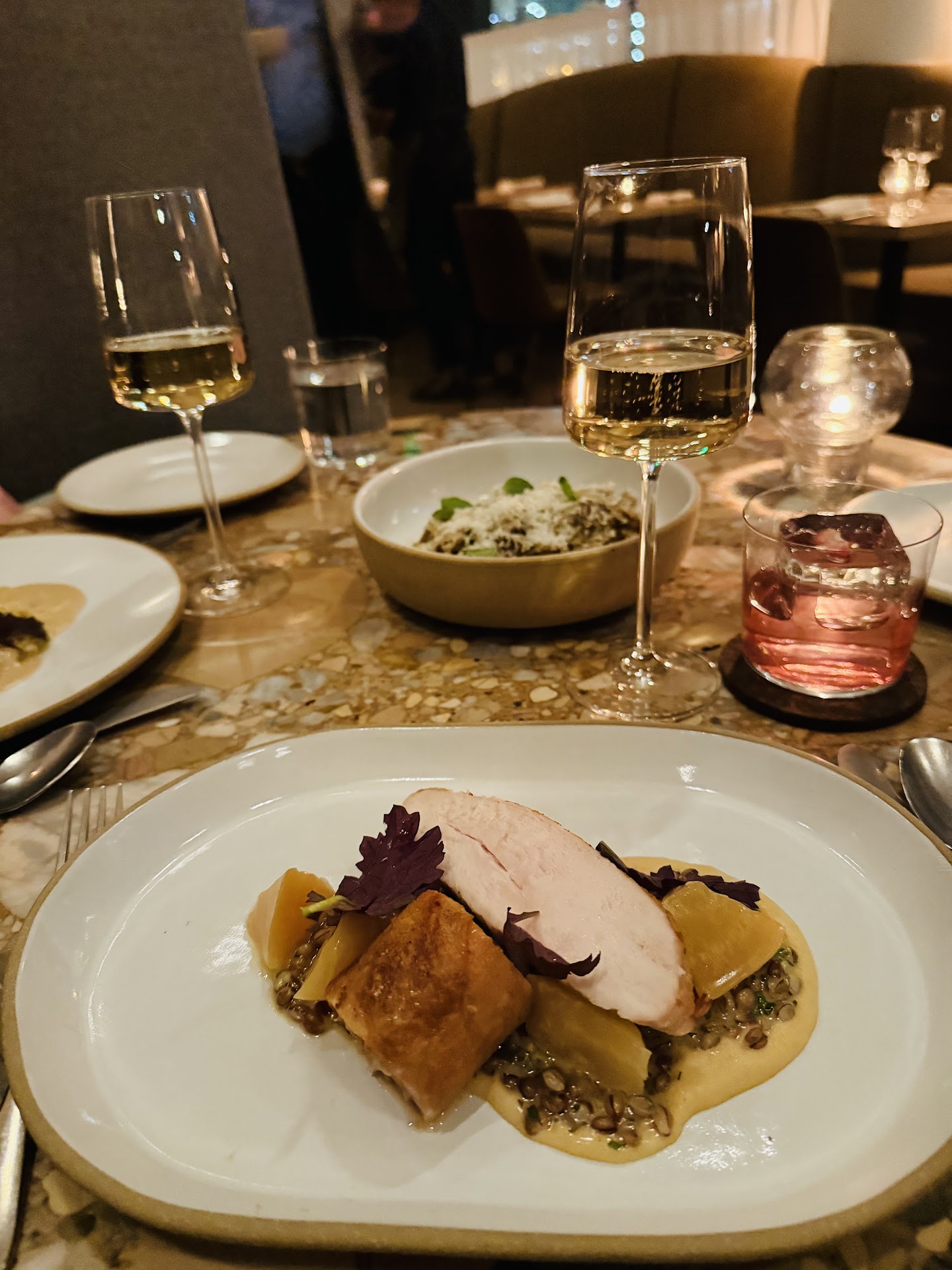 Read moreLovely ambience, however it still feels like a hotel lobby which I was hoping they would have been able to hide better through design. We arrived 10 minutes early for our reservation, but were not sat until 10 or more minutes after our booked time. I understand things happen, but it became apparent that they accidentally gave our table to the wrong party and ended up seating a group of 4 at a small & low cocktail table (meant for 2-3). We intended on having full course meals for four, so having a very small and low cocktail table made it very challenging to maneuver. The appetizers started out well and we generally enjoyed them- they were creative and had good flavors. When our entrees came we couldn’t fit the plates, glassware etc. on the table, but we did our best to make it work. Upon biting into the chicken dish, it was not fully cooked and had the texture of undercooked chicken- we actually had to spit it out due to this. We then cut into the rest to check how well it was cooked and it appeared pink and undercooked in some areas. It was not edible. We also got the Alaskan halibut which unfortunately was also undercooked throughout the middle. The halibut was only flaky on the sides and was pink and undercooked in the middle. Not white and flaky as halibut should be. Lastly, the ragu was overly salted & I’m someone who loves salt and probably can handle more than others. I still felt it was significantly overly salted to the point I only had two bites. When we let our server know, who was very nice by the way, she took the fish and chicken back to the kitchen. She then came back and said that the kitchen thought it “was cooked enough to eat.” Unfortunately, that is just not something an experienced fine dining server should ever say. She also ended up leaving her shift before the end of our meal so another person closed us out; I understand things happen but my guess would be poor management or serious operational concerns. They offered us complimentary dessert which we ordered instead of recooking the entrees which is fine, but when our bill came both the undercooked fish, chicken and desserts were on the bill. They removed them after we asked which I found to be uncomfortable that we even had to bring that up again. I know they are new and I imagine they will work out these important details, but for now I feel they have many things to improve before remaining open for meals. We also did not see managment at any point which was severely lacking. In a new restaurant I feel managment should be checking in with all tables and ensuring they’re meeting patron needs. I’m still hoping the best for them and it’s hard to write a review like this, but those food concerns are...