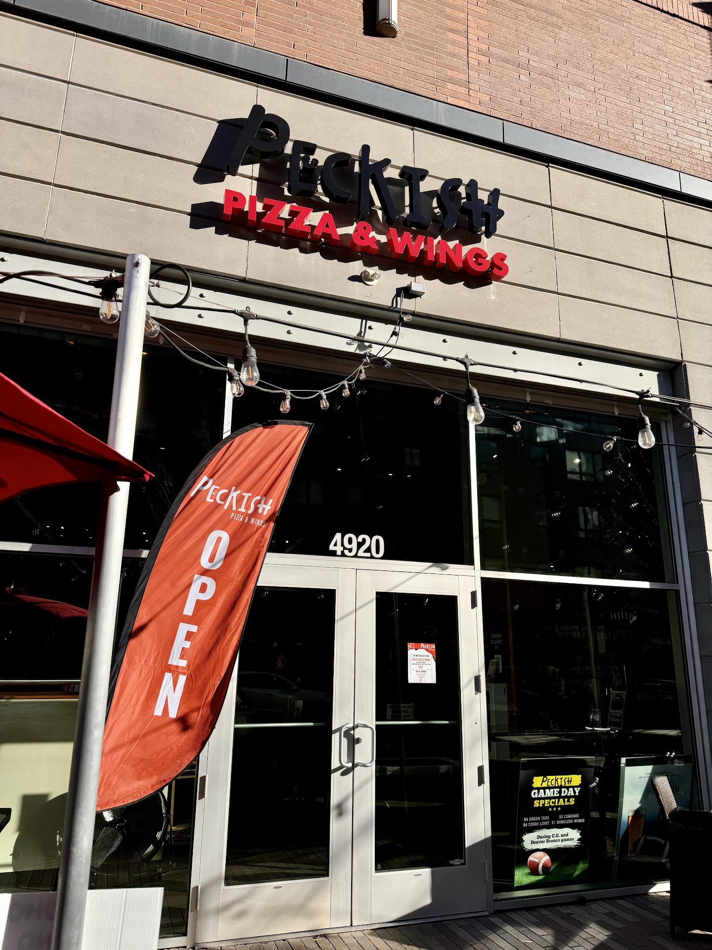 It was the reviews that brought us to Peckish DTC and I agree with them…the wings are GREAT. I think they’re lightly dredged in a flour-ish mix so not truly “naked” but it isn’t a heavy coating. Hubby had the Buff Hot (he said the heat was perfect) and I tried the Cajun Dry and they were delish. We both love spicy++ food but wanted to go mid-range for the first time here on the heat levels to see if their gauge was the same as what we expect and we were not disappointed! Wings were piping hot (temp wise) and a good size (not the puny ones that you see everywhere nowadays). We also ordered “small” BYO pizzas. Those came out piping hot too (scorched the roof of my mouth)! We’re Neapolitan crust snobs and this was near ideal. Outsides were charred, bubbly, and crisp but very center of pizza was thin and floppy so all toppings slid off. I needed a fork to eat. But otherwise they tasted great. The only reason, I mean ONLY reason I deducted a star was bc there were very few specialty pizza choices that’s why we opted to BYO which is way more expensive. Lastly, we ordered drinks. I had the black margarita and it was well done. Family behind us came in and only ordered fries so those must be really good. No complaints about service. Inside is a bit loud (music) so we sat outside. Our non-Happy Hour meal was $87 before tip, so a bit pricey (due to BYO pizzas mostly). We will def...