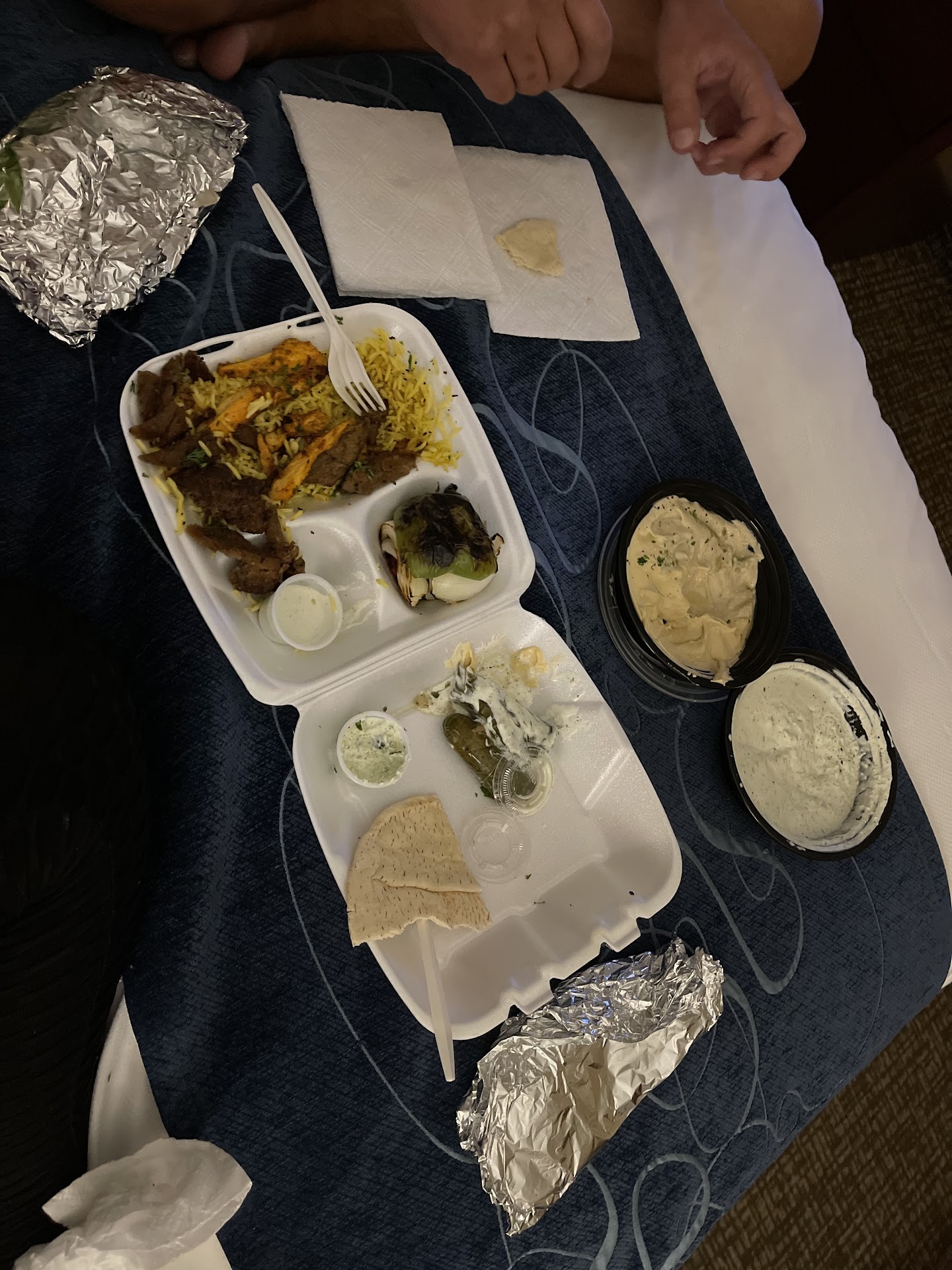 I’m with my family visiting Denver for a night and ordered the sampler appetizer and the pita combo platter to be delivered to my hotel room. The delivery via grub hub was fast and professional. The food tastes AMAZING! I am not impressed with the packaging. The tzakiki sauce and garlic sauce were heaped into one undivided dish with two stuffed grape leaves buried in the middle. The hummus and baba ghanoush were heaped into another undivided dish with two stuffed grape leaves rolls buried in the middle as well. The lamb, chicken and rice were great but I couldn’t tell you about the beef kebab, I didn’t get it despite the restaurant saying I did. It was all good for me as I have eaten all these dishes before but my boyfriend was new to the middle eastern cuisine and everything was muddled for him although he did really enjoy it. I would definitely recommend this restaurant as the food is absolutely delicious. If you’re ordering it as takeout I would suggest putting in the notes to keep everything separate if you don’t want it mixed together. This restaurant would’ve gotten five stars for me but I deducted two for packaging and missing a kebab. Also spare yourself asking for extra tzaziki sauce because all you get is a little pill container...