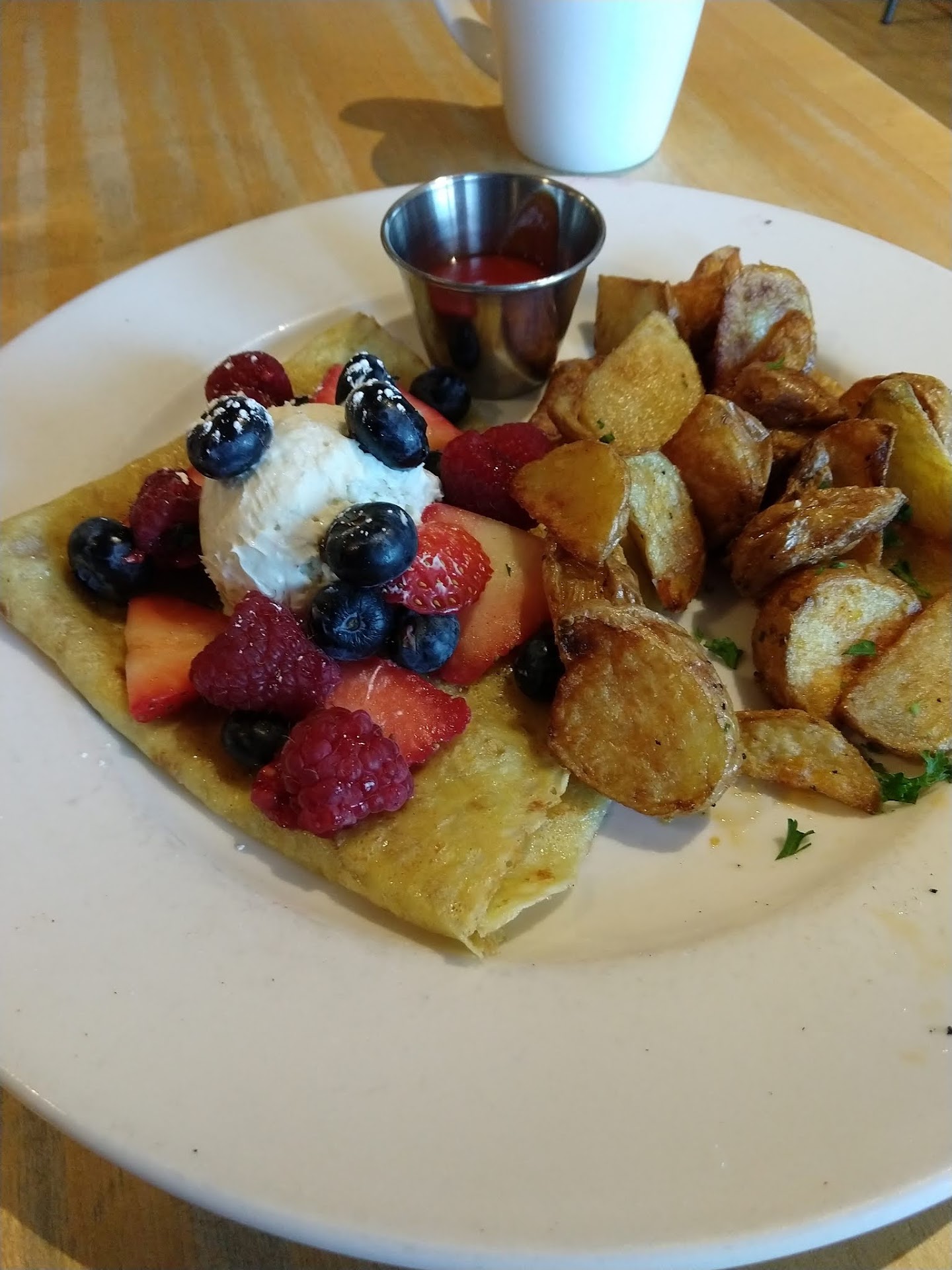 I had a long layover due to a late United arrival, so I first had lunch from the to-go half. Crappy sugar-filled pastries no different than I found in other fast food joints in the airport … well wrapped in plastic, but dry. At least it was gooey and sugary. As I remember, Pour La France used to have croissant and better quality choices.