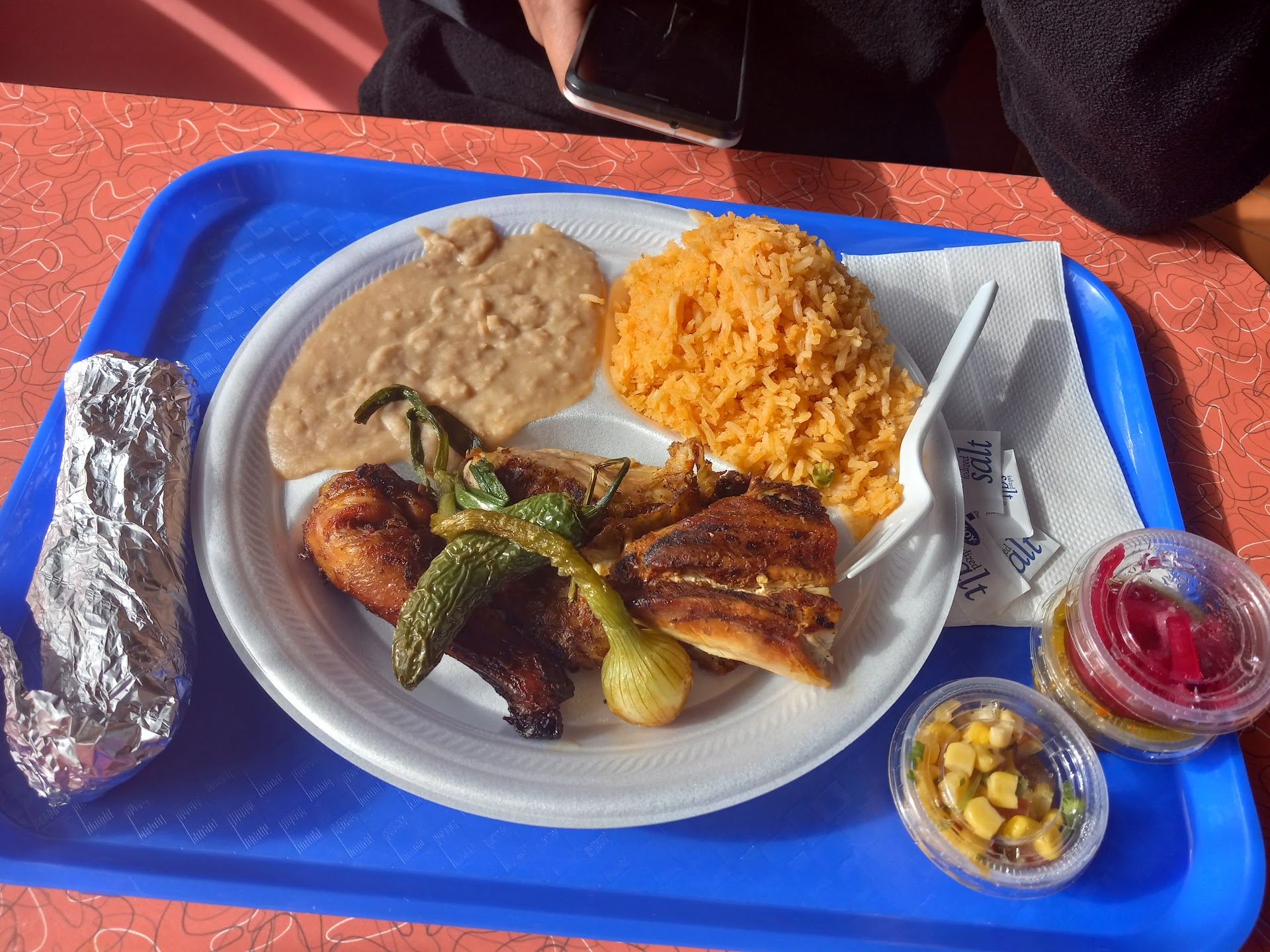 Read moreIt was delicious! I love the smell al carbón and the taste. I ordered a whole chicken ( un pollo completo ) but I didn't see the wings there. I'm not sure if they really give you the whole chicken because it's cut in a weird way that you can't really tell if it's the whole chicken in there. I guess next time I'll have ask them to give me the wings... but it comes with rice and beans, cebollitas, chiles toreados, salsas, tortillas, red onions and like a corn salsa, all these for $25. I feel like it's a little expensive for what it comes, but the taste of the chicken It's really good. I haven't tried the rest of the menu, but I can really recomend you the...