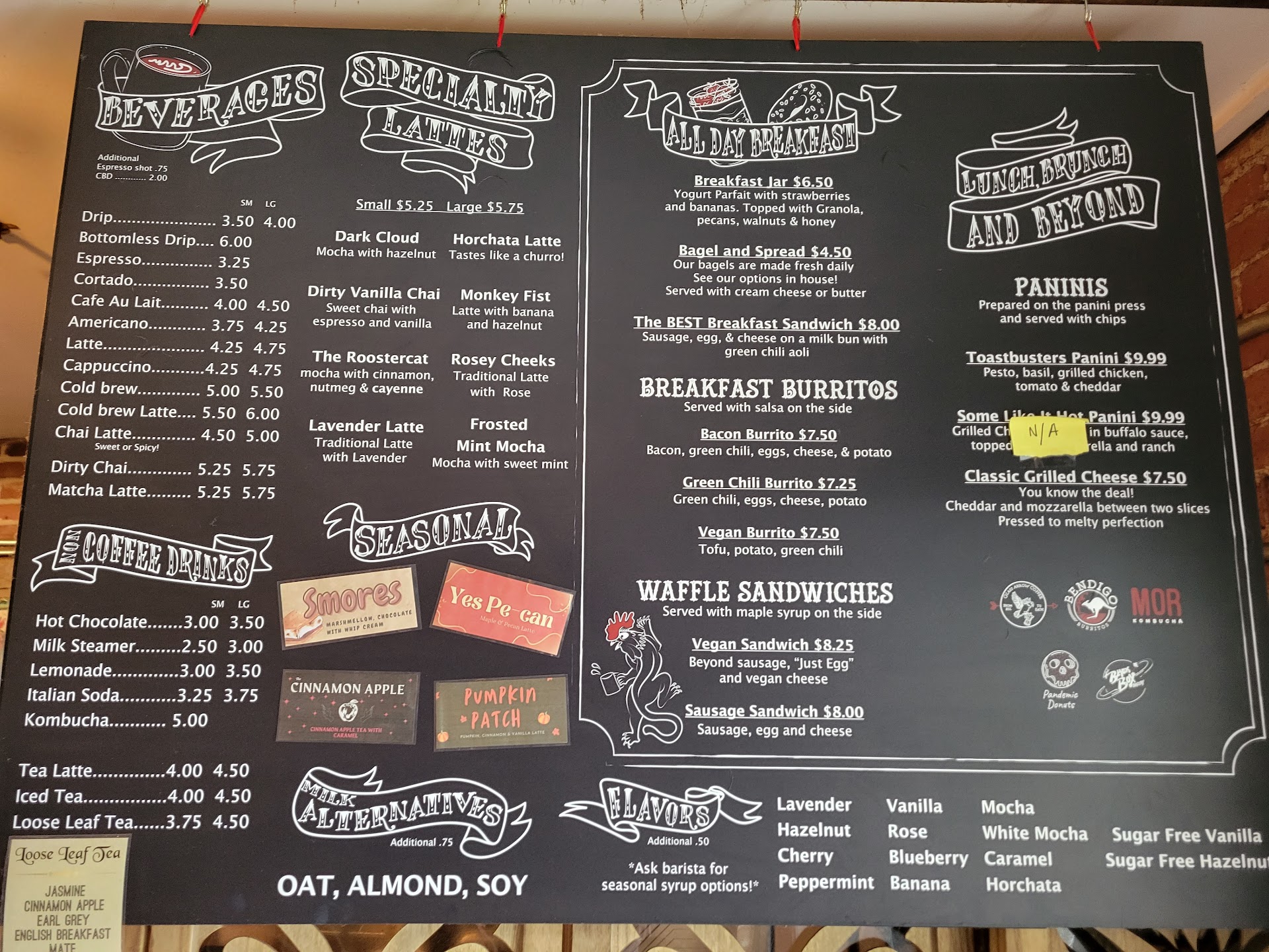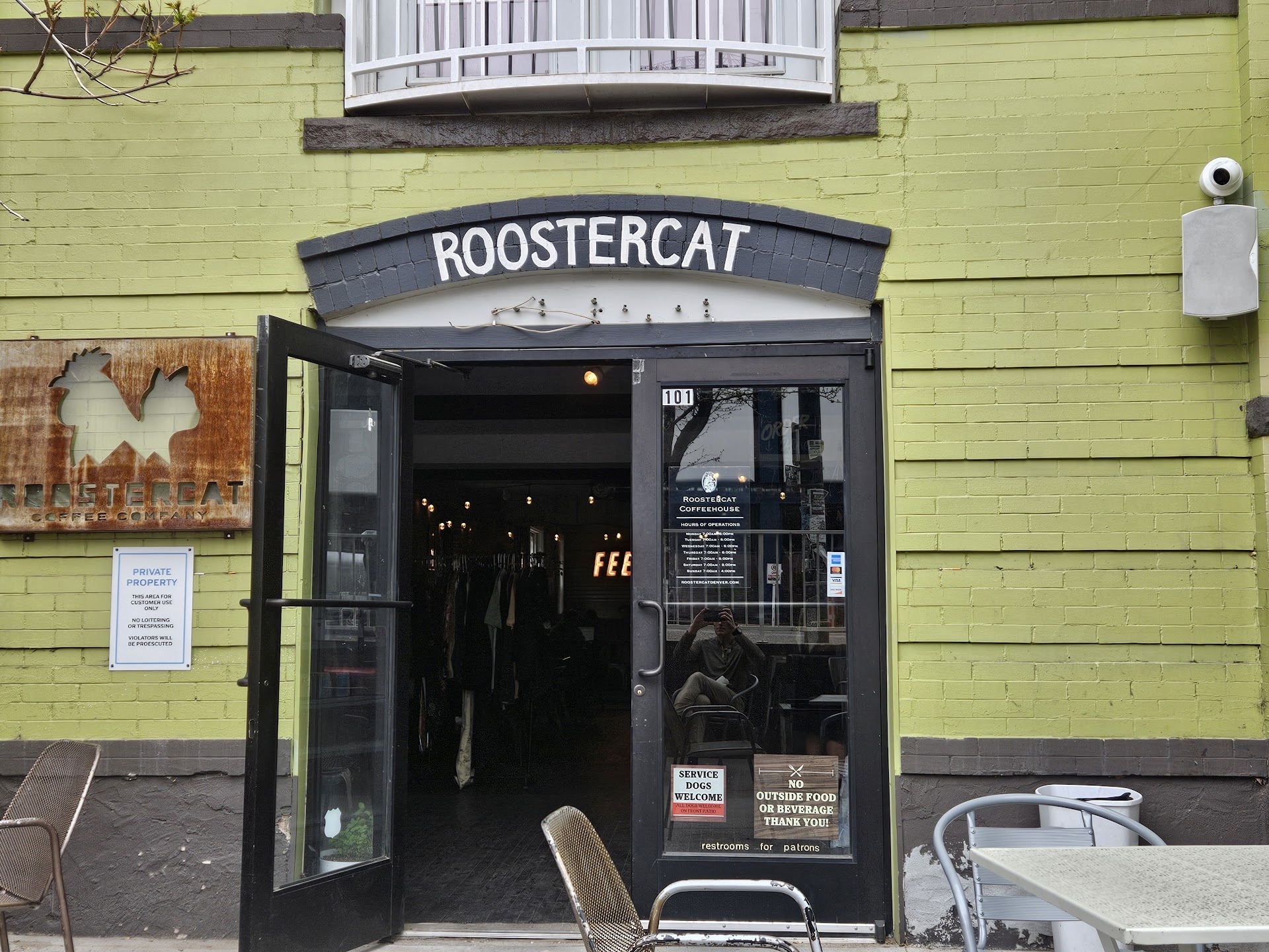Out of Necessities! Pros: Nice environment in cozy location. My tea was good. Cons: Service and cleanliness. I wondered if this place was going out of business based on the lack of items available, the disrepair of tables, and the overflowing garbage. Roostercat Coffee said is open until midnight. My friend and I were there at about 9:30 pm. The place was full. My friend ordered an espresso. She was told that they were out of espresso mugs and was given a giant paper cup with her shot of espresso at the bottom. She asked for sugar and was told there was no sugar, just Splenda...seems odd for a coffee shop. I initially ordered black tea, but was told they were out of black tea, so I subbed for green tea. I asked for honey - and was told they didn't have honey. When we went to sit, the first two tables we chose were dirty or in disrepair. When we finished our drinks and prepared to leave, we found the garbage cans overflowing and ended up leaving our cups at our table because there was no where else to put them. Meanwhile, the barista stood behind the counter with her head phones on scrolling through her phone. My impression - either the barista doesn't have great work ethic or customer service skills or the place was understaffed and she couldn't to leave the front counter to restock or take the garbage back. I bet there were dirty espresso mugs that needed to be washed in the back and their was sugar and honey in the back that needed to be restocked. Not impressed and I...