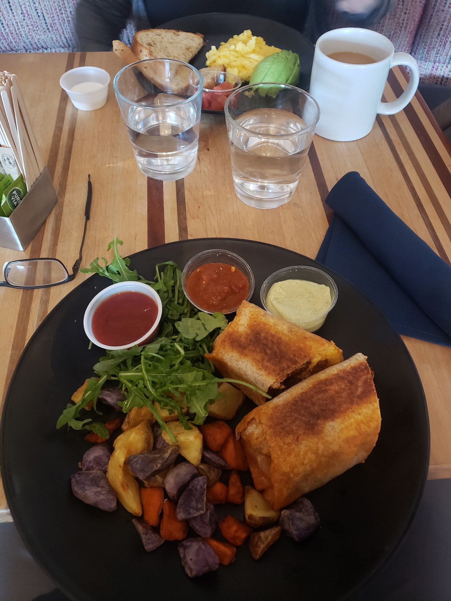 Read moreI don’t like leaving negative reviews, but this was… not good. It wasn’t too crowded, the hostess and the support staff very friendly. My son and I ordered the mini sliders and the vegan breakfast burrito, respectively. I asked to make sure mine was vegan and that both were gluten free, as we are both intolerant, especially my son. I specified THREE times (once when I ordered and then twice more before she walked away) that mine was vegan and both were gluten free. She verified each time that yes they were. She brought our food out and walked away before I even registered it. I saw that mine was a side of plain arugula, a side of plain potato wedges, and a pile of what I assumed was the breakfast burrito. I ate a bite and it was literally the spiciest thing I’ve tasted. Ever. My son ate a few bites while we waited for her to come back so i could ask about the missing tortilla. Eventually she came back and when I asked she said “I guess it wasn’t gluten free or something” and walked off again before I could reply. I tried to eat it anyway and cut up my potatoes and mixed them in, in hopes that it would mellow out how spicy it was, but it was still so bad. My whole mouth was on fire. She finally walked by and I was able to get her attention. I asked if there was a way to tone it down a bit maybe a side of dressing or something, when my son said his stomach was hurting. I turned to ask him what was going on and walked off. She came back with a side of dressing and asked if he was ok. I said I thought so but wanted to make sure that his bread was gluten free, at which point she said no, it wasn’t. I tasted the dressing and could tell it had dairy and asked “is this vegan?” She said yes. I said “so there’s no dairy in this?” And she said “oh, yeah there’s milk in it.” I gave up trying to save it. I couldn’t even eat my $20 “burrito” it was so spicy. My son ended up throwing up and had a terrible stomach ache for the rest the day. She didn’t even apologize for screwing up our...