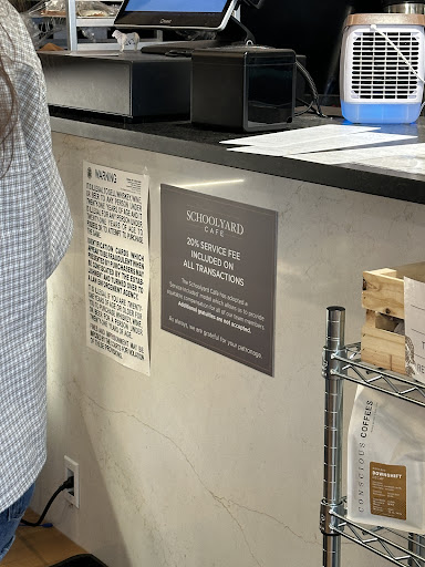 In other reviews the owner also says it is a “transparent fee”, which in my opinion by their very nature fees are not transparent, just increase your prices!!! Further more, I ordered in the Schoolyard Cafe and the only sign I saw mentioning the fee is under the counter when you order, so I did not even see the fee until is was sitting there pondering why my food was so expensive and then saw the hard to see sign. If your fees truly are transparent, then you need to put up more signs in more prominent locations.