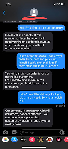I donât think you guys want small businessesâ orders. I tried to place a will call in order and go pick up myself. Then I got informed with my salesman that I canât and he cancelled my order. He said I either need to order 20 cases minimum for delivery or be a âpartnering customersâ (which I need to order weekly) in order to place a will call in order. Is there a rule that I must order 20 cases minimum for delivery? Or if I want to just pick up myself I still need to order weekly from you guys? Last time I called in the main line and they said I only need $500 minimum, but my salesman said I must need to order 20 cases minimum also. So even though my two cases already went over the $500 minimum but I got told that I need to order 20 cases minimum. So I need to order whole bunch of other things that isnât necessary for me in order to get the things I want. I know that Iâm not order from you guys a lot. But Iâm just a small business, and I donât know why they try to make thing so difficult now. When I tried to call the main line of the company, the representative told me he canât do anything but tell me find the salesman. When I tried to tell him, can I talk with a manager. He said there no one that I can talk to except my salesman. Both are not trying to help and donât want my business Thank you Shamrock. You are losing me, I know you guys donât care since both your representative and salesman treating...