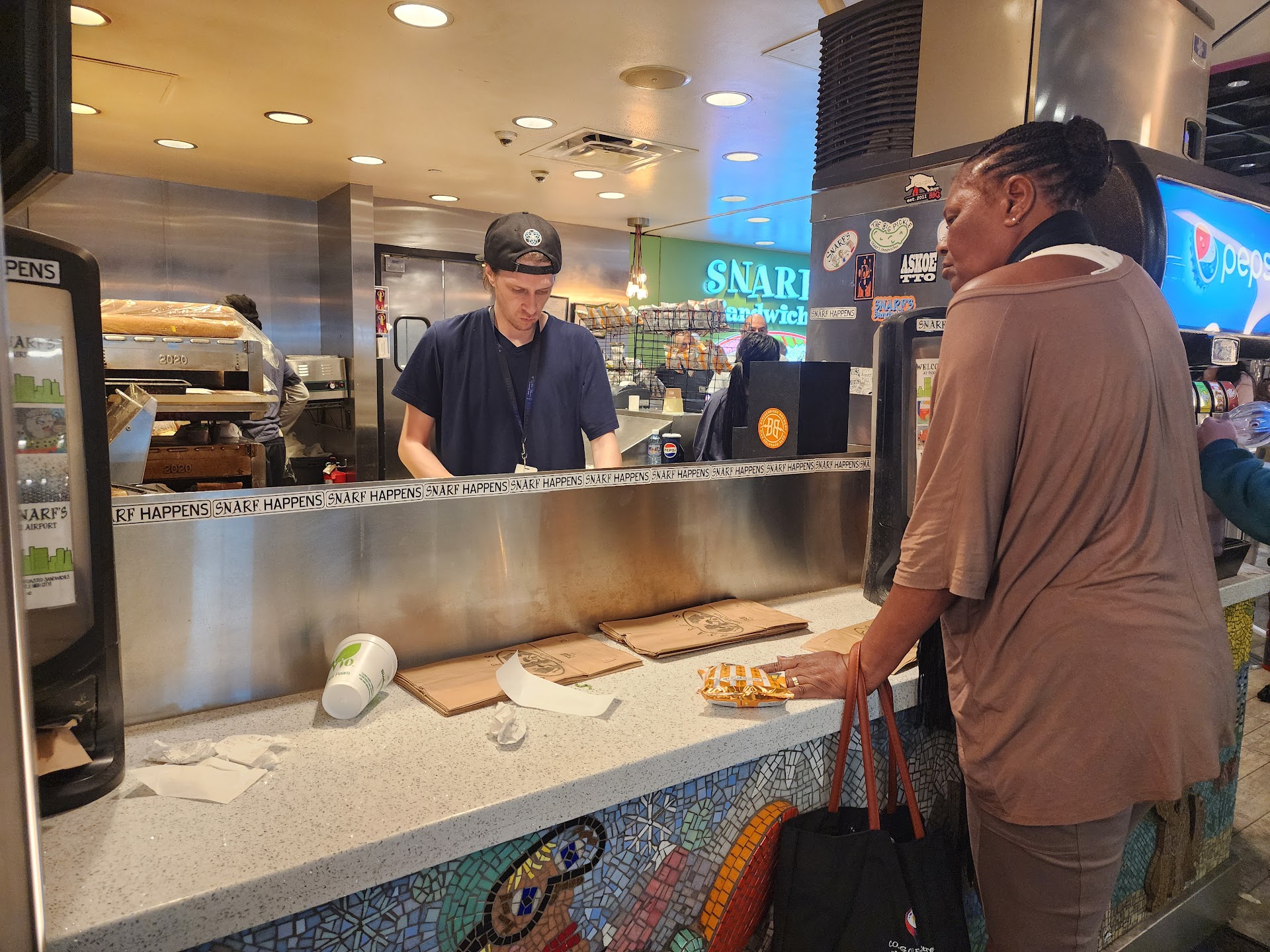 Recently had a couple long layovers in Denver between Feb. 5th and 8th, and because of the carrier, I spent a lot of time in the Concourse A. Looked around and around for something simple and decent for a meal, but wasn't finding anything in the airport that was anywhere near affordable. Came upon Snarf's Sandwiches and decided to give them a chance. The prices were extremely fair, the sandwiches were heated (awesome), the bread (I chose wheat) was incredible. They were stuffed with the items I chose, and totally delicious!!! I threw in some chips and a soda and still didn't go over $20 (this is in contrast to the another place I looked at in the airport, where a cheese burger and a draft domestic beer would set you back over $40). The service at Snarf's was so helpful!! It was later in the day, my eyes were tired, and was having trouble reading the menu display, so the person taking my order grabbed a paper menu, walked me through the selections, and even made recommendations based on what I was looking for. I completely appreciated everything these guys did for me!! So, if you're stuck in the Denver's International Airport, hungry, and looking for a great meal that won't empty your wallet, then Snarf's is definitely where you want to go! Thanks again for everything...