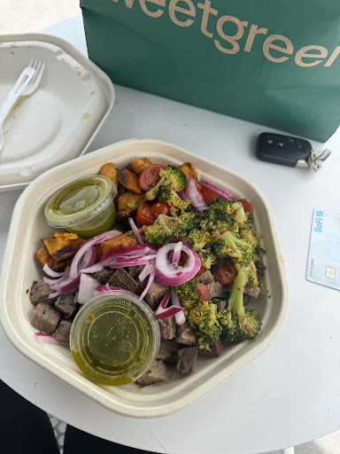 Was happy to try Sweetgreen. I had never heard of it before but have always been a fan of this type of restaurant. I went with my son on Friday at about 1pm and expected it to be very busy due to the location and time of day, but it was empty. The staff was very nice and prompt with their service. I usually don't eat steak, but it was the only option for protein that they provided, so I went with the Garlic Beef Protien plate. In my opinion it was OK. The beef was kind of bland. They recommended the pesto sauce, and I wasn't a big fan of the flavor combination. I really did like the sweet potatoes, though. They were very good. Portion size wasn't bad. I ended up buying my sons bowl, and he got the miso glazed salmon salad with a scoop of chicken added on. The salmon was good. It had a nice flavor. The miso glaze wasn't overpowering. I was surprised they added a whole egg to the bowl if you ordered eggs, and they gave you half of an avocado as well. (Extra charge, btw) We got the green godess dressing, and i must say... it was amazing! I ended up using it on my steak plate as well instead of the pesto! The thing that really bothered me about his bowl was that it cost $26!!!! $26 for a mid-sized salad is a little crazy in my opinion. I might try it again, but I won't go...