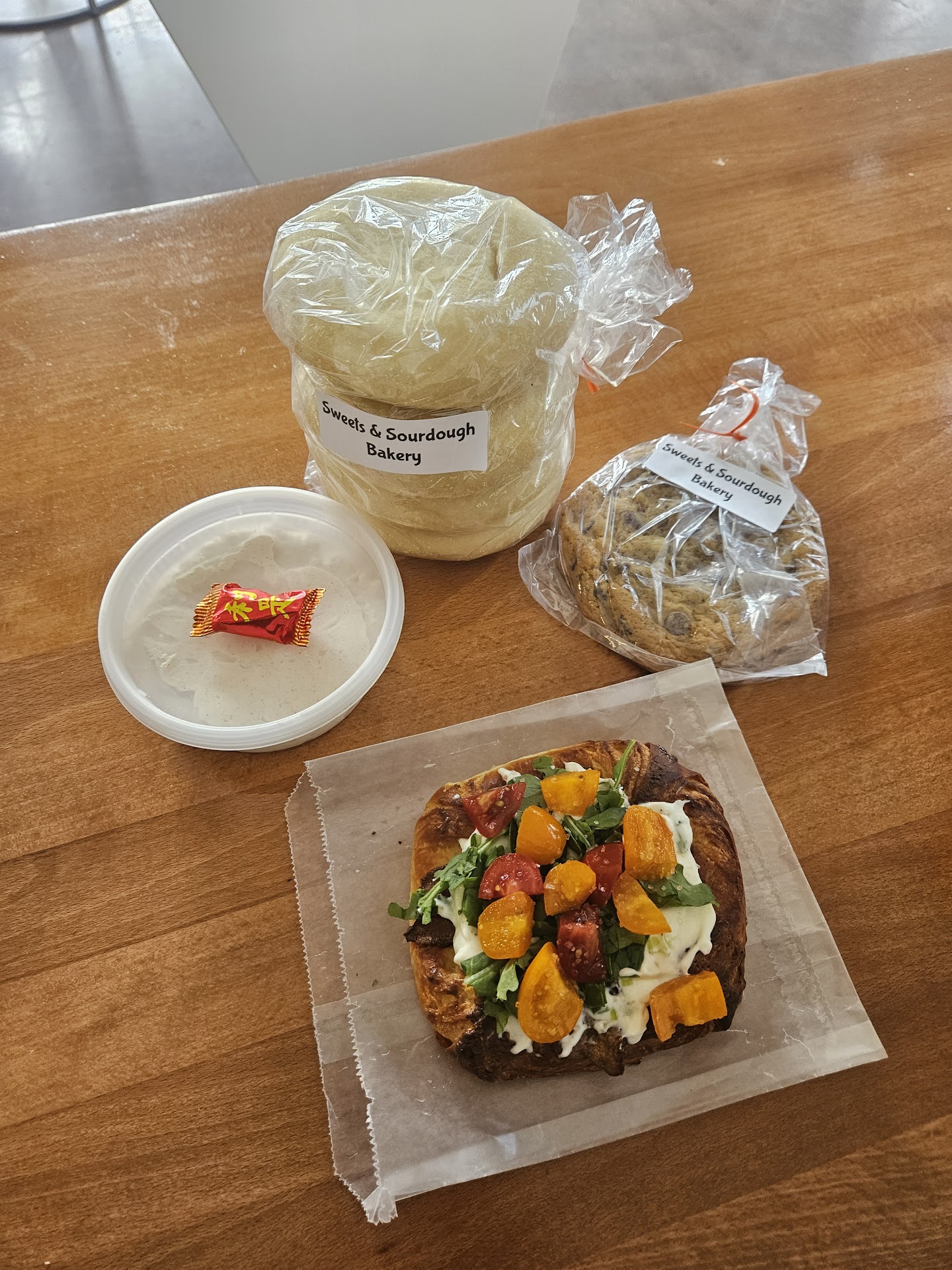 I see a dangerous (to the waistline) new tradition emerging in our household. Every Saturday we've bought a small assortment of sweet and savory goodies, some for immediate consumption and some to parcel out over the week from our freezer. Everything has been so delicious. On the savory side, so far we have tried a spinach and cheese pastry, one with tomato cheese, sliced sourdough bread, and the world's most delicious salted soft pretzel. On the sweet side, a cardamon bun, a swirly thing with almond paste, and granola. I very much appreciate that the sweets are not too sweet-I often feel like some bakeries confuse sweet pastries with candy. The balance at Sweets & Sourdough is perfect for our taste. Who knows what this week will bring. Staff have been wonderful and so friendly, and the space is terrific. Welcome the neighborhood. I can't wait to try the other two businesses in this innovative,...