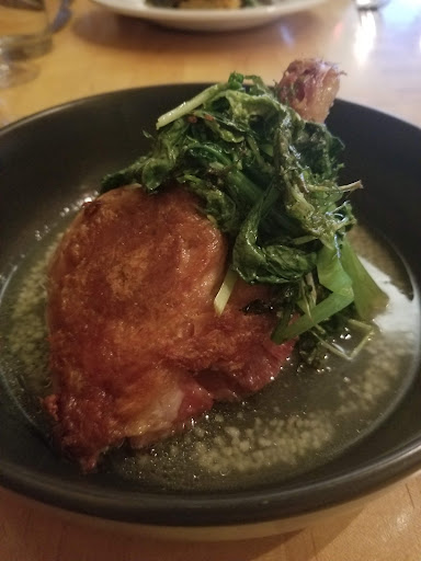 Read moreMy boyfriend and I went here to celebrate my graduation from some training that I had been going through at work. I was looking for some fine dining, yet denver seems to have a lack of actual fine dining. This comes close...the food is on point, but with a few flaws that will keep in the upscale casual category. First I'll talk the good parts! The food was really good and creative. We started with the pork cheek buns. You dont see cheeks much on many menus so when I do, I always get them...these didnt disappoint...a bit too much bread to filling ratio though. Next I had the duck confit with couscous, nectorines, wilted greens and ginger broth. Confit is another thing not used much around this town...it was very nice, crispy outside, soft and tasty inside. The set was good...but...hey chef...time to change those sour out of season nectorines! My boyfriend had the flank steak?....it came with some corn pudding and I'm not sure the rest...the corn pudding was good! Best part of the dish...the steak wa cooked and seasoned nice...he said it was a bit overly chewy and had a bunch of gristle. For 35 bucks I think a nicer cut could be used...cheap cuts are for cheap priced restaurants. We shared the orange sumac cake with peach butter and candied ginger....the cake by itself was a bit on the dry side, good thing it came with so much peach butter. Overall the dish was pretty good. Now my nitpicks...plastic patio furniture inside. I'm not huge, but I'm not little either and the chair leg slipped a bit....when I was much larger I've broken chairs like these...PLEASE GET REAL CHAIRS...these plastic chairs just cheapens the appeal to your restaurant... Second....for this nice of food, there should be atleast a small level of dress code...the gentleman in dirty work overalls and a tank top just didnt fit in. 175$ per tip for 2 glasses of wine, 2 entrees, 1 starter...