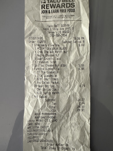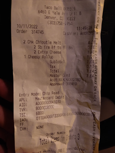 Read moreI have only frequent this location twice. The first time we ate inside, store was so nasty. Dirty tables, trash full and soda area was so smelly/sticky. I thought okay, maybe it was a crazy busy day. So, I gave them a second chance and went there after work ordered triple layer nachos no red sauce (got nacho supremes), order nacho fries (they were barely warm) and a wild cherry pespi.. I get to the window to be informed they are out of wild cherry Pepsi, I say, just Pepsi is fine. I got handed colored carbonated water. I inform the manager working the drive thru, he gives a weak apology and offers something else. Since the other choices are not any I would choose, I just get a water. The manager asks (not just gives) would you like a refund for just the soda. I just laughed and was annoyed, said no. That's when I get my food and notice my nachos are wrong (after spending 15-20 in the drive thru) now I have to go back through. I get a poor excuse of an apology from the manager and offered nothing. . Not a credit, not a full refund. . Nothing. That was my second and last chance EVER to this location. I'll drive 15 minutes or more to a higher rated one when I get the craving. As long as I know it's not owned by the same franchisee or corporation; because if they let that location slip, hard telling how their other...