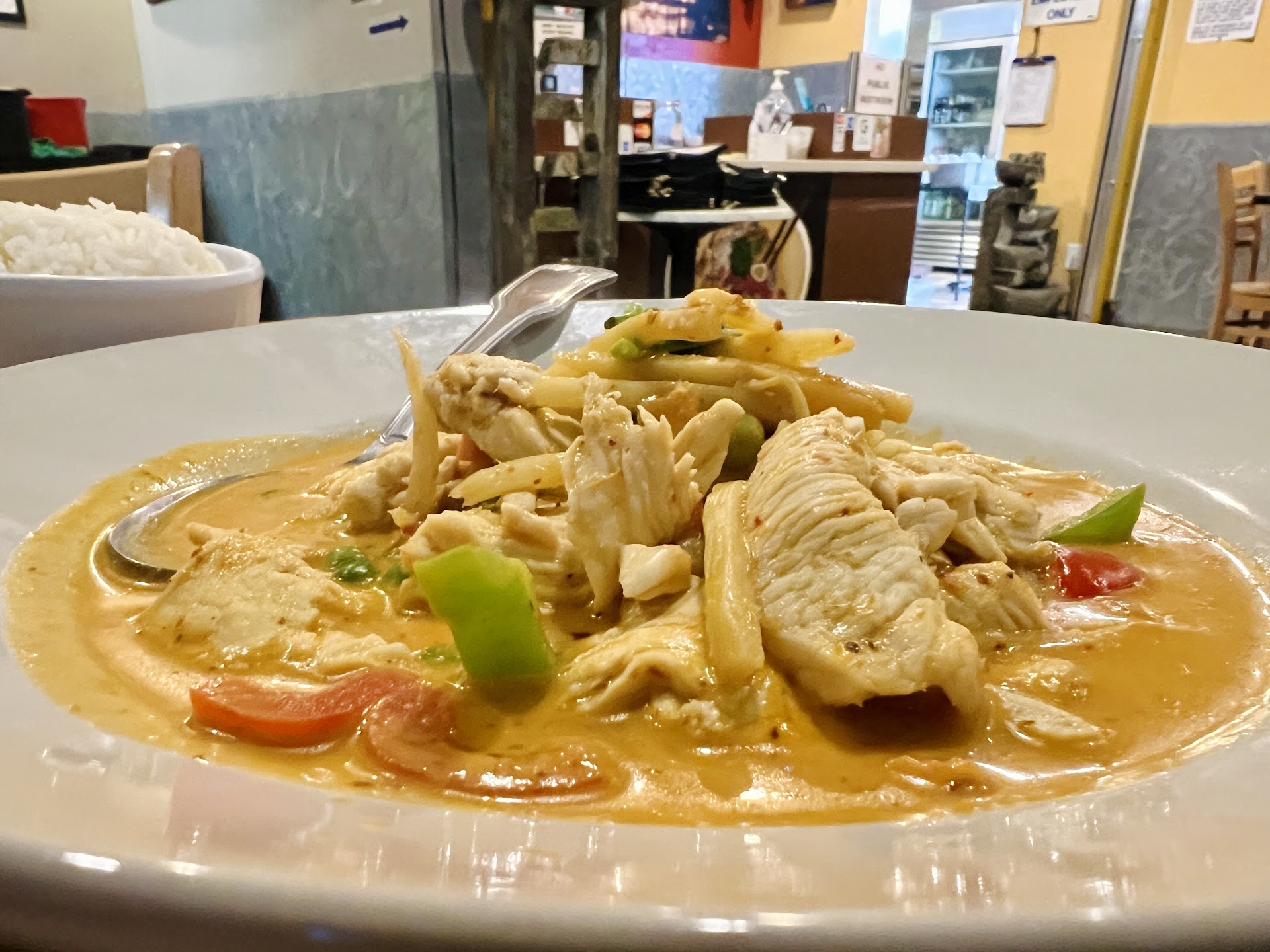 It's downstairs when you walk in from the street level of the mall. Unpretentious and just authentic Thai service and food. Service is naturally friendly and unobstrusive even with her being the only server working on a Saturday evening. We ordered the papaya salad (which would be super elevated if they offered salted crab) but was good. Ordered level 3 but suggest 4 if you want it more spicy. We also had the Tom Yum soup with shrimp as level 3. Cannot gush enough about how amazing they married the lemongrass and tamarind flavors together. My all time go to is the red curry because I love bamboo shoots. Level 3 on this is perfect spice level for us calientes and the adventures wimps. It's one star short because during the winter she doesn't serve the mango sticky rice because it is not as fresh and in season. My return visit will be expecting sampling of all the desserts.
