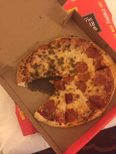 After about 45 min we got our food and left on our merry way and the real battle began. I tried the first pizza and it tasted like 3 week old cheese on cardboard with a splash of tomato paste and 1 jalapeño on it. So I tried the meat lovers which I think consisted of dog chow, ham and the same 3 week old cheese.