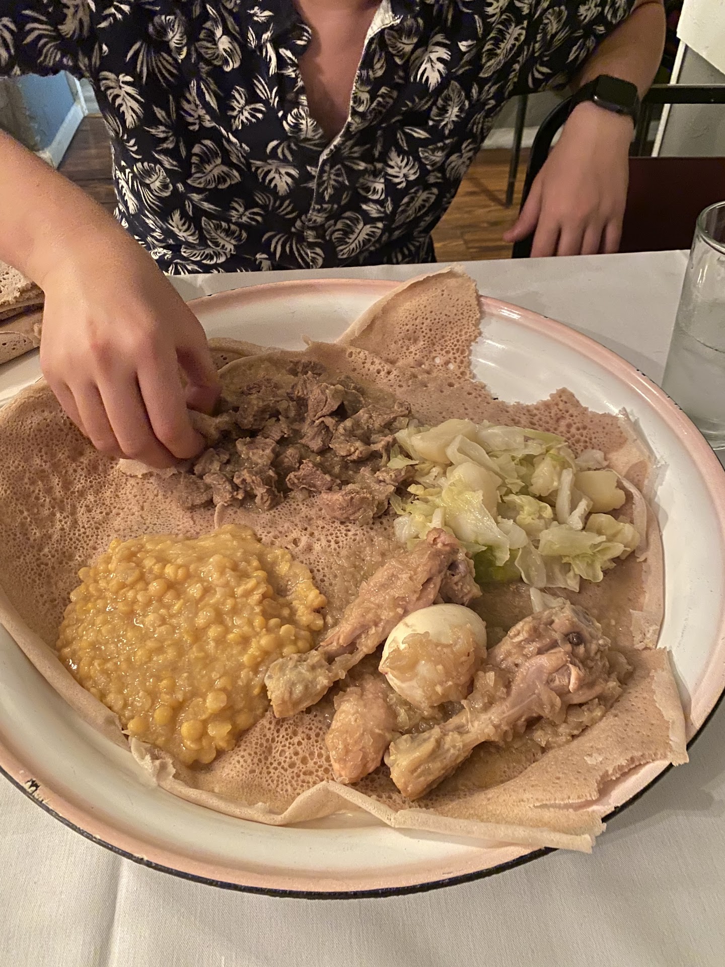 Read moreThis local restaurant offers a lovely and unique dining experience. My boyfriend and I shared the chicken and lamb stew pictured here, which included lentils, cabbage, and an egg. It was cool to eat it with the injera, a flatbread-like food on which the stew was served (you don’t really use utensils in this restaurant for a more authentic experience). We also tried mead (honey wine) and a red wine, which were great.