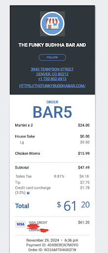 But it did not end there. We got the chicken dumplings (8), which I thought were pretty good and actually great portion sized. We got the bill on a hand held device with just the total showing, not an itemized receipt. I ended up texting myself the receipt and finally looked at it when I got home. Neither of our drinks were actually the happy hour price and they also charge a 3% credit card fee that was not disclosed.