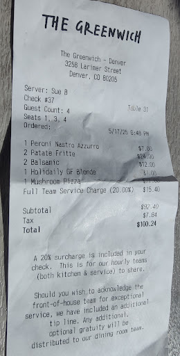 Read moreMaybe it was my fault for having too lofty of expectations, but when I saw that Denver had a restaurant that was trying to channel NYC vibes, I was pumped. My wife and I had lived in NYC for half a decade and we have extremely fond memories of our time there, especially when it comes to food. Whether it was saving up for months get a three-stared dining experience or getting Halal food from our favorite corner vendor--not to mention the pizza. So needless to say when I learned about The Greenwich, the decision was made for us: we had to try it.