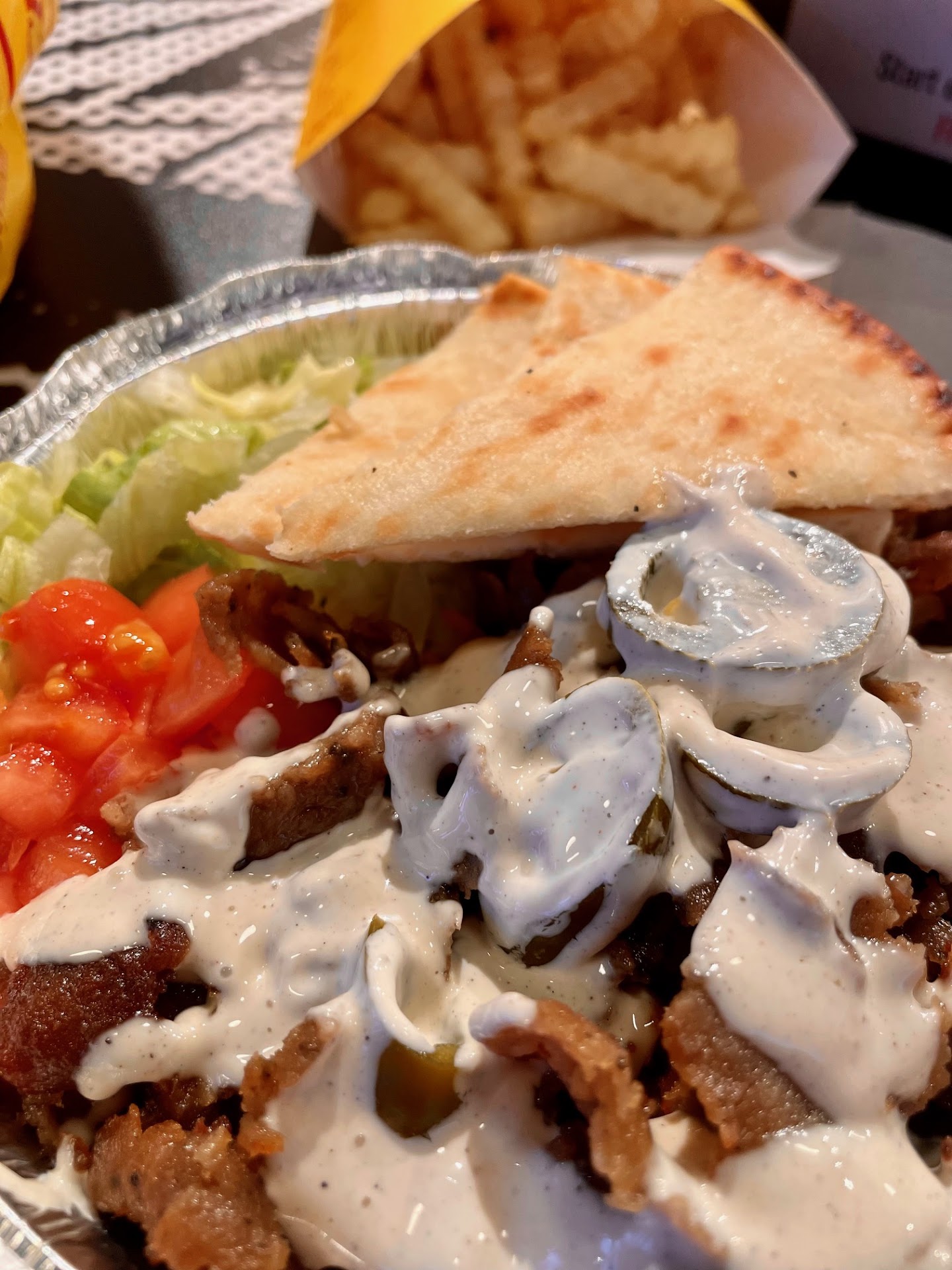 The white sauce I thought would be too much but it paired so well with the favored beef and spicy sauce. Pita was great to help the spicy heat lol! I really liked the yellow rice too (good texture and flavor) It was quite a large portion and we had leftovers to take home.