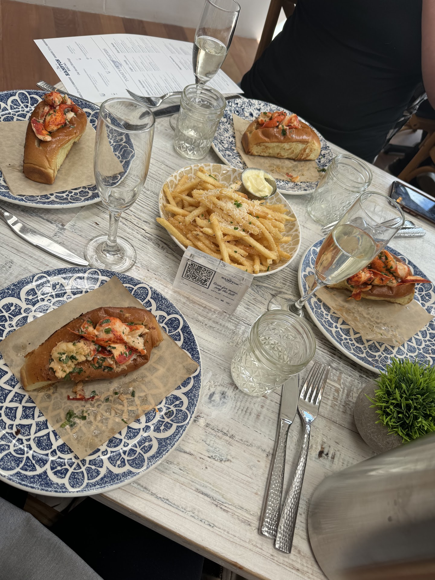 Greeted by unfriendly hosts and told to sit in the already insanely crowded waiting area and wait to be called. There were at least 20 open tables throughout the restaurant, yet the waiting area was so full that even the waitstaff couldn’t walk through to get to tables. We had a reservation for 7pm. Got there at 6:55 and were finally seated around 7:15. Again, plenty of open tables all the meanwhile. Server was pretty quick to take our drink orders (a glass of rosé and a g&t), but we had to wait 25 minutes (not kidding) for the drinks to actually arrive at the table. Food was simply very bad. Ordered the crab and shrimp bruschetta as an appetizer—tasted like the crab came out of a can. Had the pipette pasta with sausage as my main—arrived at the table cold, gritty, and extremely oversauced. Noodles were so overcooked/had completely lost their structure to the point where it was literally impossible to pick up with a fork. They should call it a cold soup and give you a spoon. My friend ordered the burger and they may as well have just brought her a plate of frier oil instead. Never saw the server after he dropped the main courses off. At that point, it didn’t really even bother me because I wanted to get out of there as fast as I could. Luckily, there was a QR code at the table that you could use to pay… INSANE prices for BAD food.
