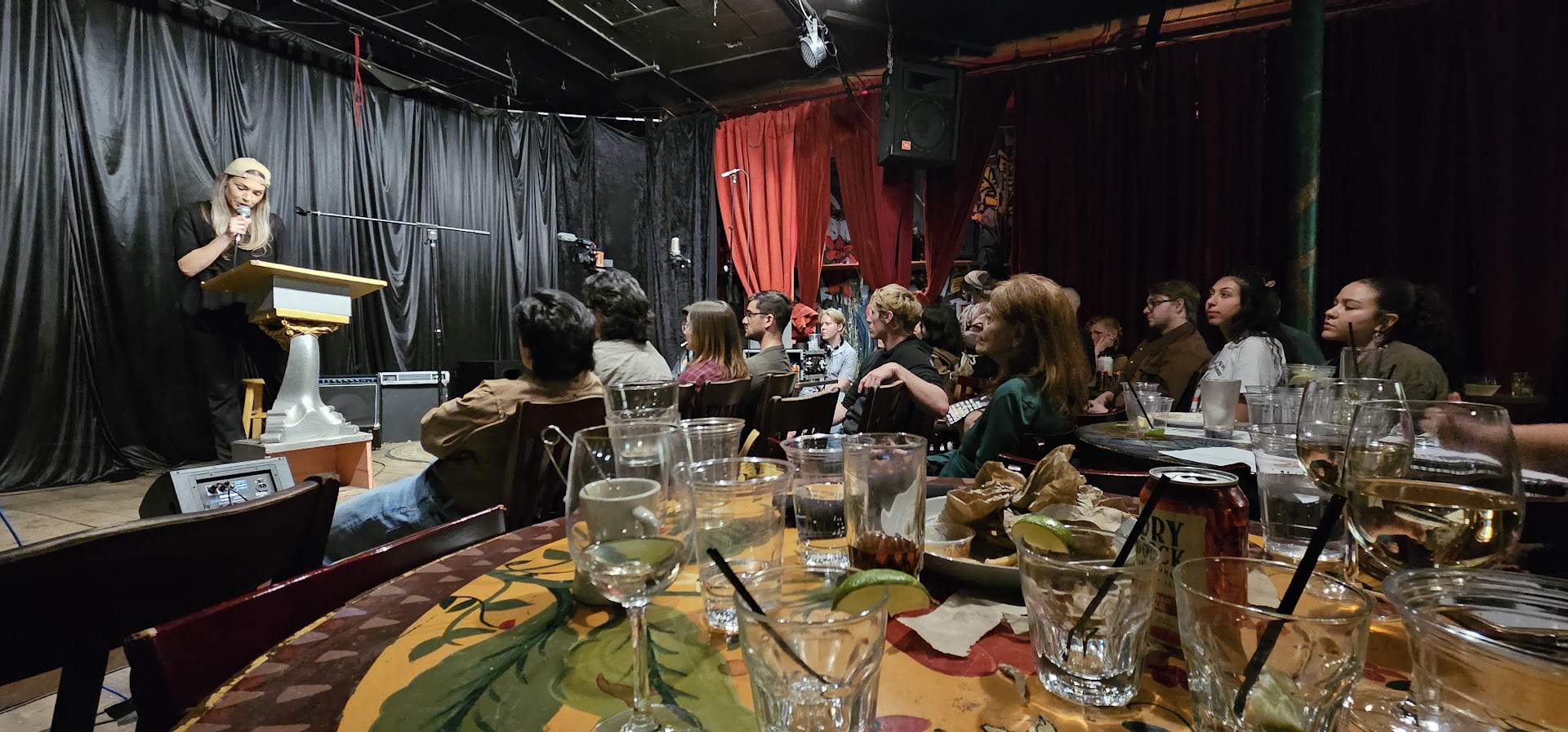 The Pearl is first and foremost a bar/lounge. They have decent bar food, but it's secondary to the vibes and people watching. Now that I've been there a few times, there are three major areas: the upstairs, decorated in a space theme, is sometimes blocked off as a separate party/event, as is the "Jungle Room" downstairs. The "Rose Room" is the main space with the restaurant, bar, and lounge inside. Each space has its own stage and upstairs is a large warehouse-like space for dancing with a separate bar. The space and the acts that frequent it seem community-based and DIY.