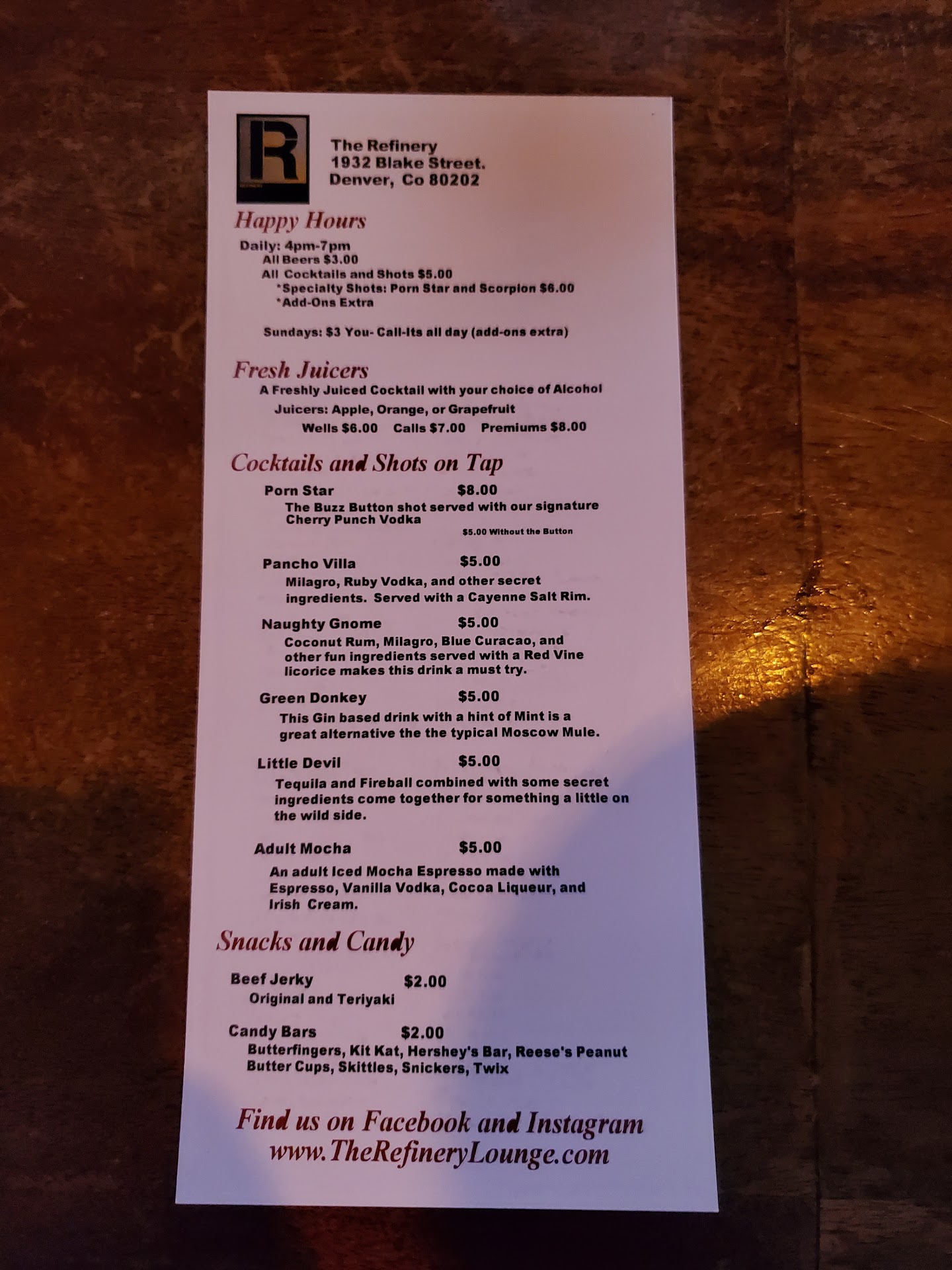 Read moreFirst of all, I don't like going downtown. Second of all, when I go downtown and someone asks me the best bar to go to, I always lead them to Refinery. Excellent, over the top service, chill atmosphere, and reasonable prices. Third of all, and most important today, honesty. I have OCD and know when I lose something, no matter how rough of day. Post-Rockies, I pulled out my credit card and my $100 bill popped out on the bar. Stupid? Yes. Sloppy? Sure. But, I knew I lost it, when I lost it, and where I lost it. Tommy, thanks so much. I bartended for 14 year and would have done the same thing, but also would have had a tough time doing it. I told my story, and Tommy threw the $100 bill back at me. Huge karma points, and nice to know there are still sincere, honest people out there. Amanda, you already know you are the bomb, and wife and I always are glad to see you. People, if you go downtown, or visiting, and just want a cool bar that is reasonably priced, schedule in the Refinery. Thanks again, Tommy....