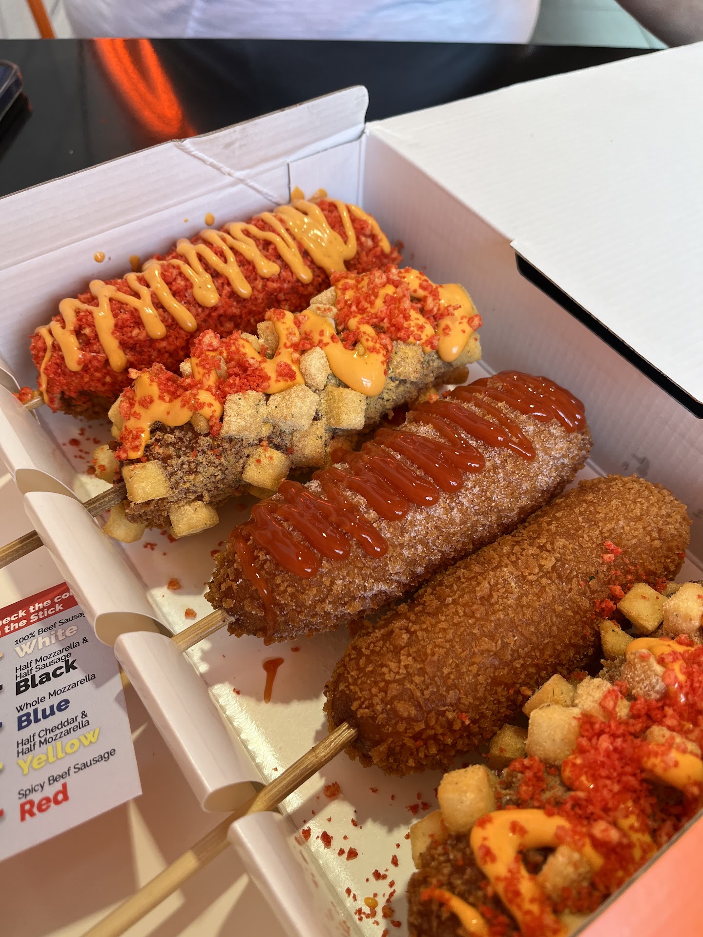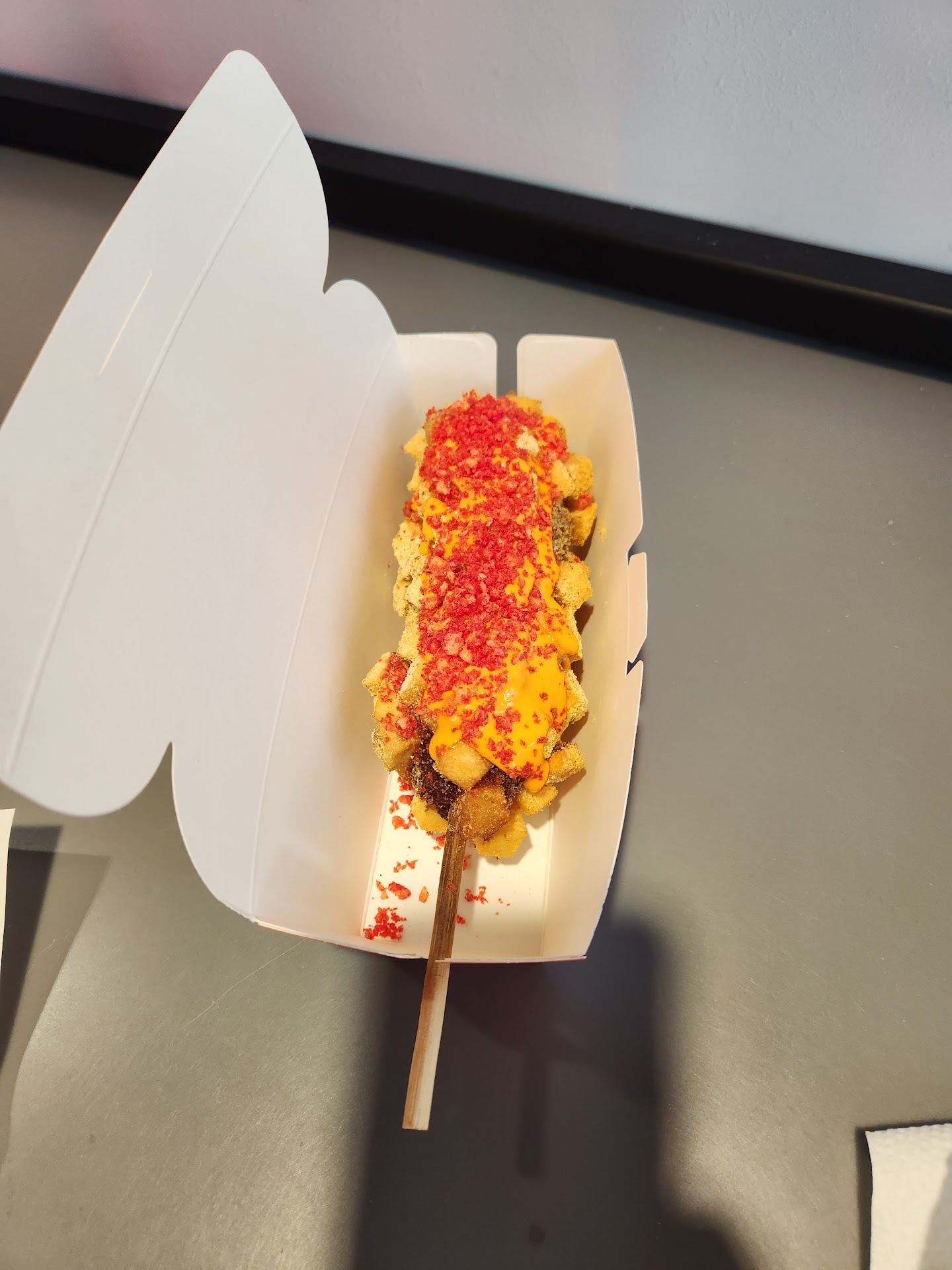 The corn dog batter was too sweet, too dense, fell right off the horribly overcooked and lackluster hot dog. The hot dog was so overcooked it wouldn’t slide off the skewer and required entirely too much effort to bite through.