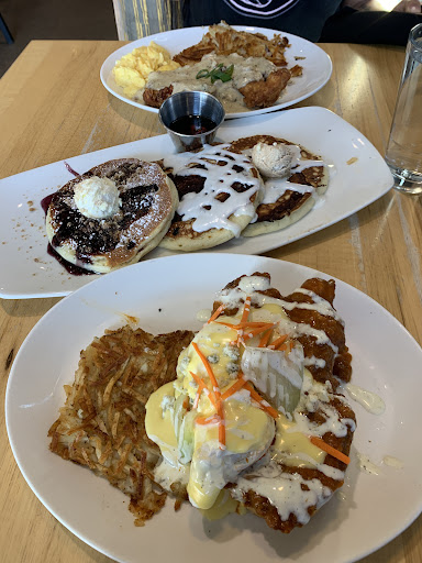 Read moreI would've never guessed this place would have brought me the most delicious food I've ever tried in my life, but it did. I have never been more in pure bliss than I was eating here. It was heavenly and other worldly. I do not mean that lightly. This place was the best. I had the chicken and waffle benedi and it was just perfectly breaded crunchy chicken that was still so juicy on the inside. The chili maple bacon butter and bacon jam just complimented it so well. I asked for a side of the gravy because of other reviews. It didn't need it, but it was delicious as well so I put it on my hash browns. My girlfriend had the breakfast bowl and ordered a urban beet juice that tasted wonderful for beet juice which I'm not usually a fan of. To top it off we finished with the stuffed French toast. You can judge it off the picture. It left me speechless. It was that good. If youre borderline please just get it. You'll thank me. The atmosphere inside the restaurant was great. You do have to park in a free parking garage to get here but it's a really short walk. You would not guess what was on the inside when you're driving up. This place should win awards for how good the food is. There was no wait and the service was spectacular and food cam eout extremely fast. There was nothing to even begin to complain about. This place was perfection in a restaurant. If someone gives this place a negative review they should be tried...