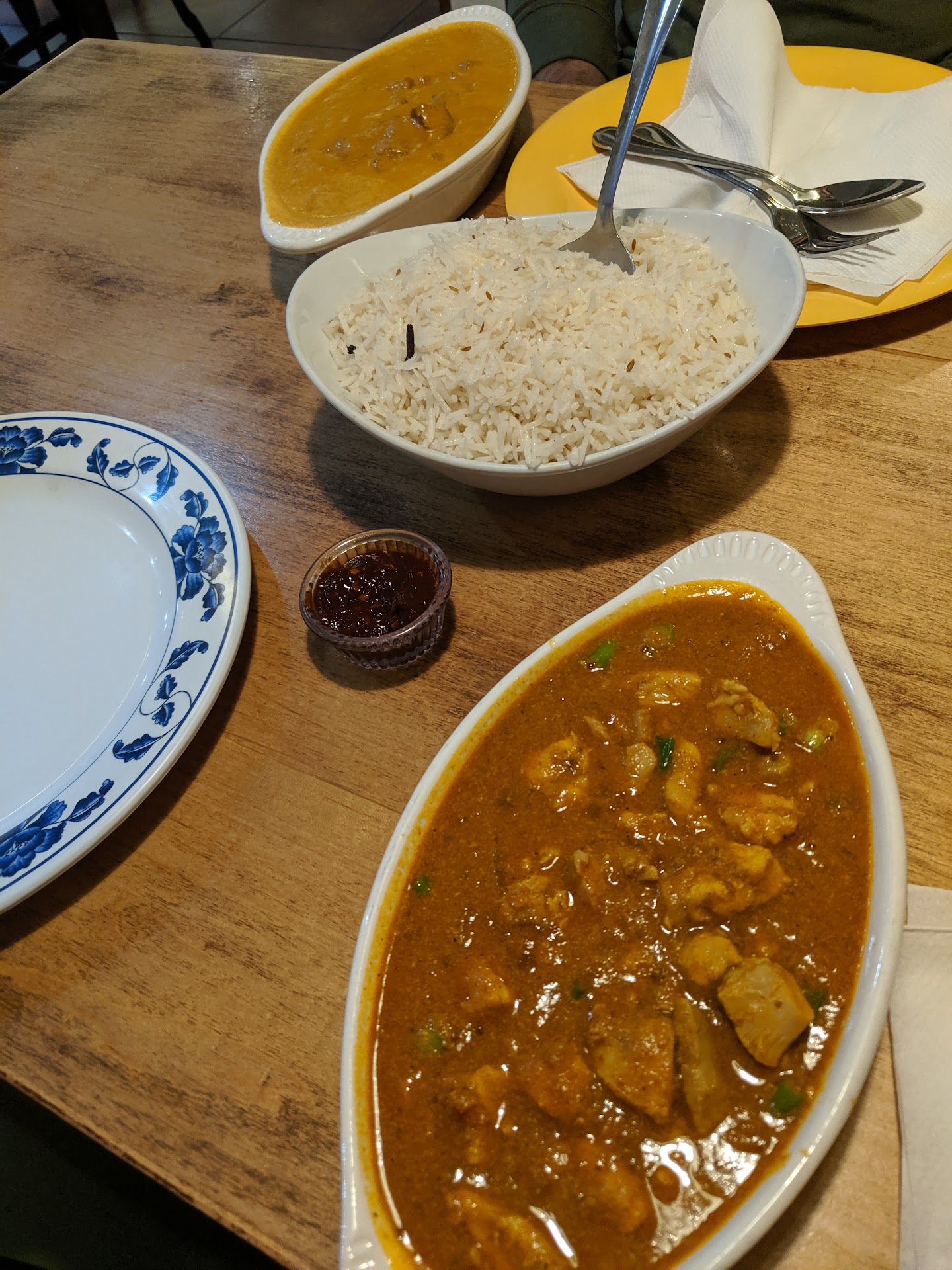 Read moreFirst time trying Indian food and this place came across when looking for a good spot to go. It was late night, on a Sunday so the fact that they were even still open was awesome in itself. Walking in, the decor is light and bright, very welcoming and you can choose the option to sit for done in, or order to go. The staff was very friendly and warm as I walked in with my friend. We chose to eat in and right away had menus with so many different options to choose from. From the menu, you could see what was vegan/ dairy free/ gluten free/ and nut free, making it super easy for someone like me, with many food intolerances, to make an informed decision without having to wonder what may or may not be in a dish. I chose the chicken curry with a level 3 spice with the level 4 sauce on the side just in case. My friend ordered the Lamb Tikka Masala with a level 2 spice. The dishes came quick, and were served with basmati rice on the side so we could use as much or as little as we wanted. Mine was delicious! I even added some of the level 4 sauce they provided for an extra kick. And it was perfect! Meat was very tender, rice was not over done, and the curry flavor itself was not super heavy but just enough. I tried my friend's masala and it was thicker with a more tomato tasting profile which was equally as delicious but a tad too heavy for me that late. We both ate every last drop with no remorse about our food coma we entered into. This place is definitely worth a try, the staff, food, and atmosphere overall really made this dining experience 5 stars as a whole. I can't wait to try something else from there next time! We...